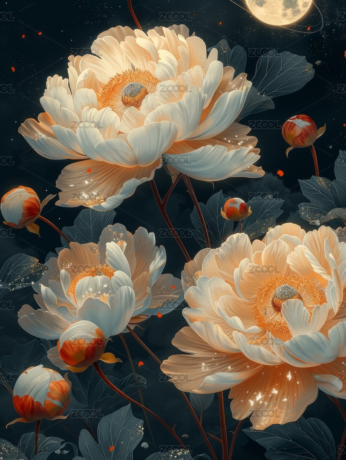 夜幕下绚烂牡丹盛开月光洒落唯美画卷