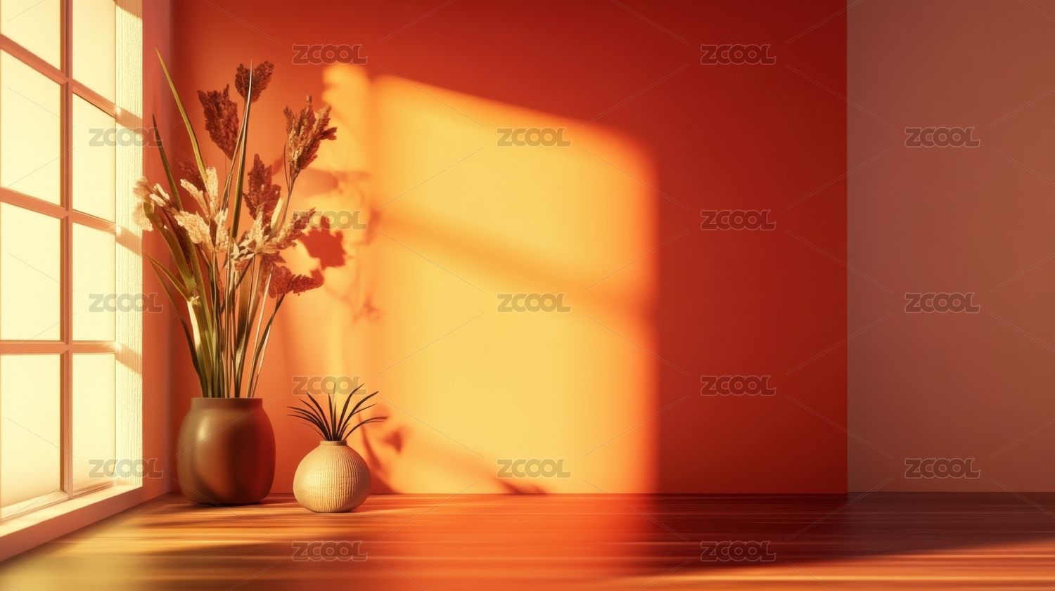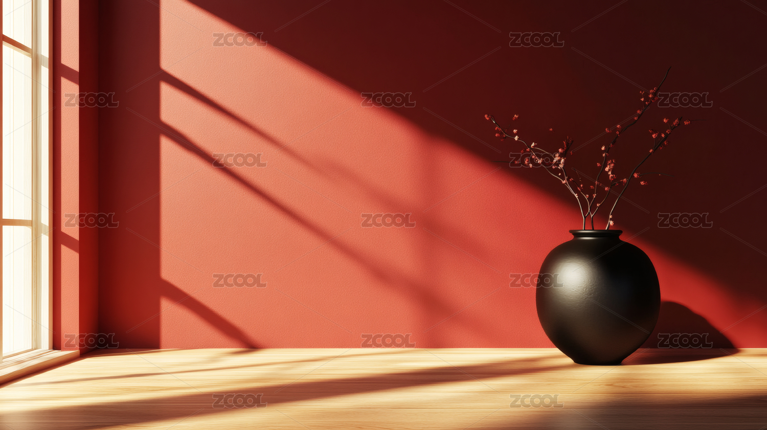 阳光透过窗户照在红色墙面上的室内静物