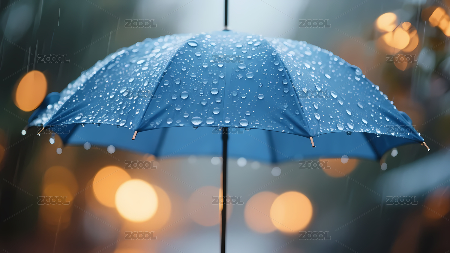 蓝色雨伞与雨滴特写