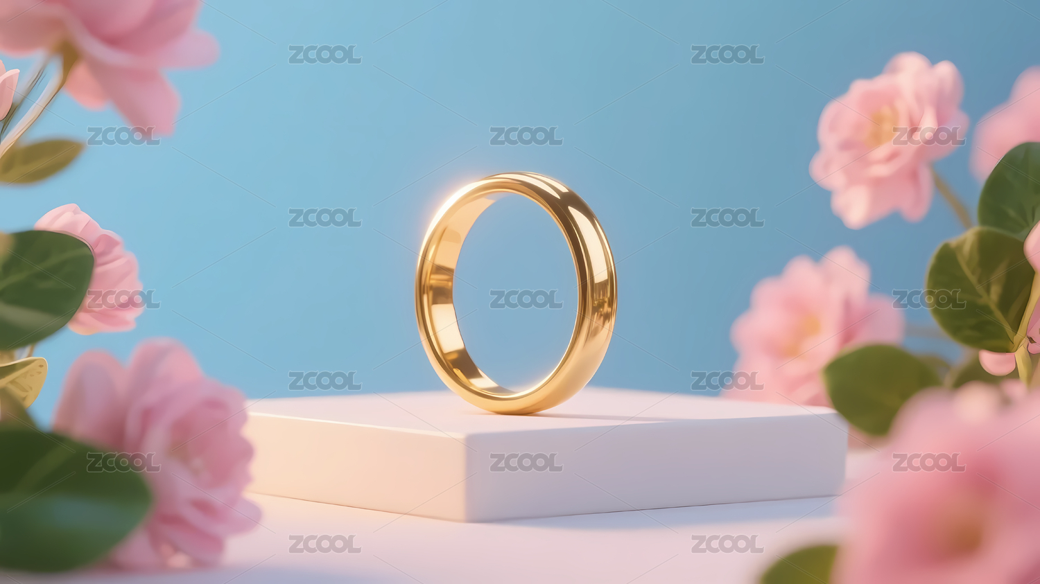粉色花枝旁的金色戒指