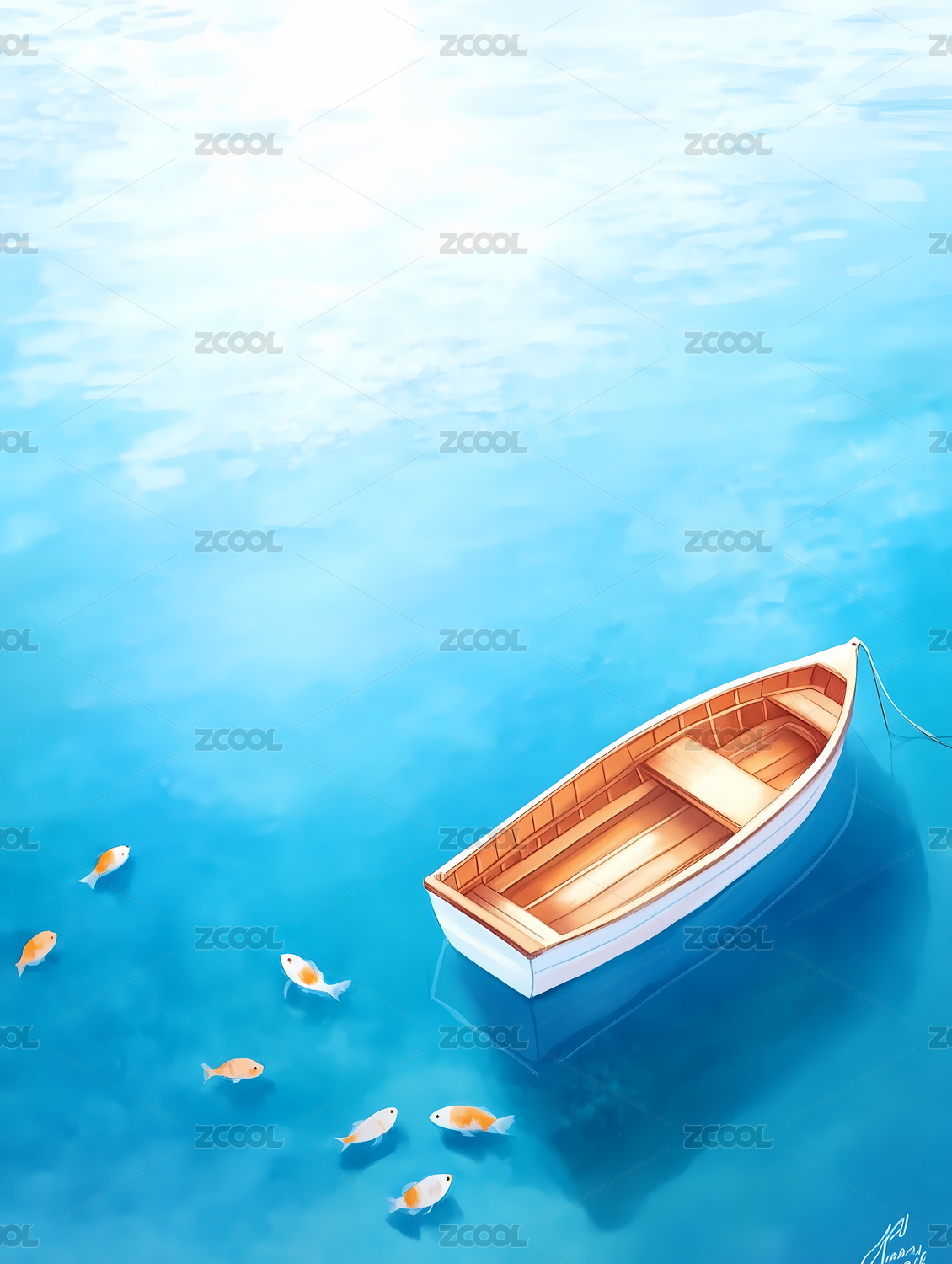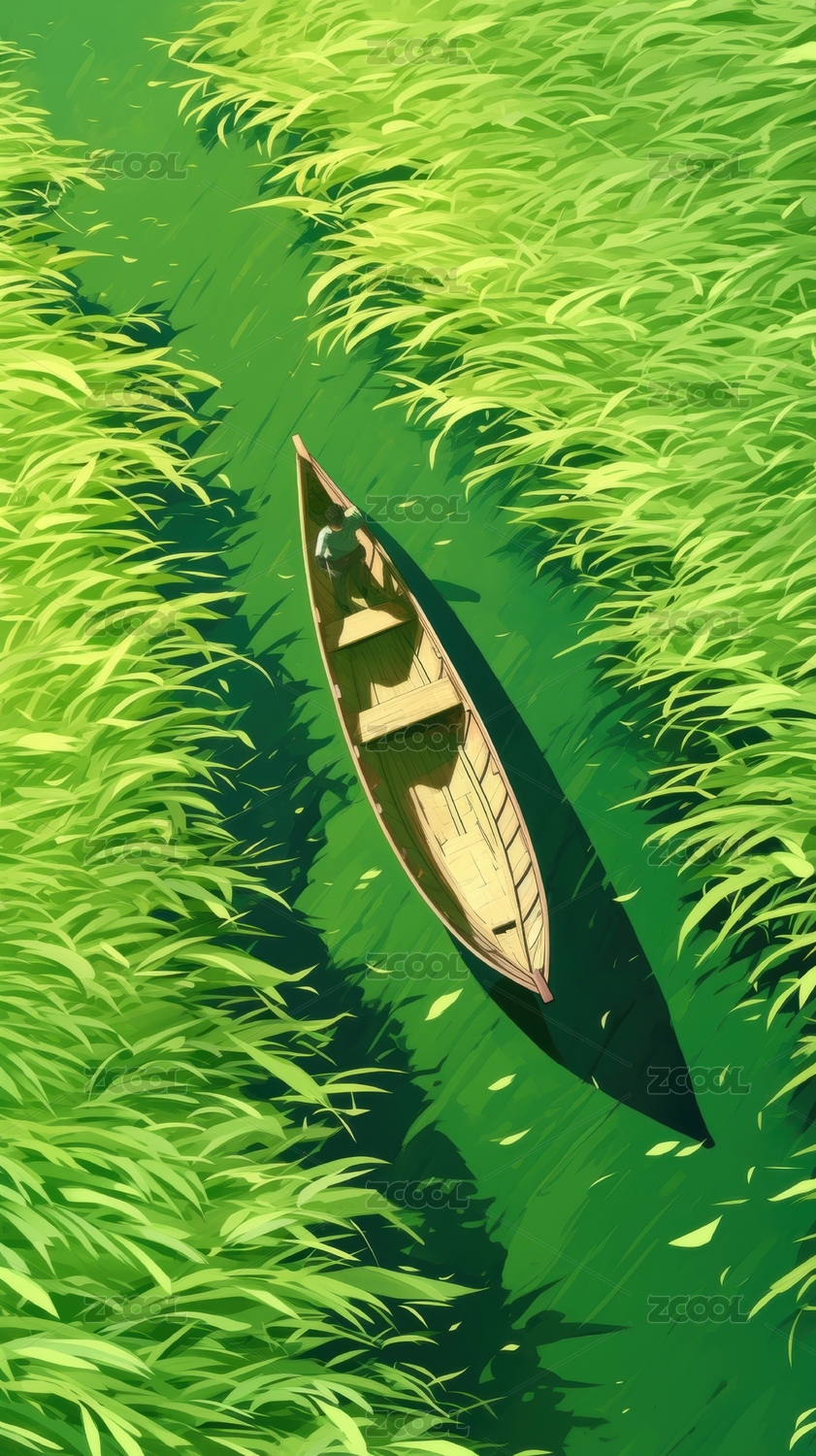 小船,水面,木舟,睡莲,荷叶,自然,风景,插画,静谧,宁静