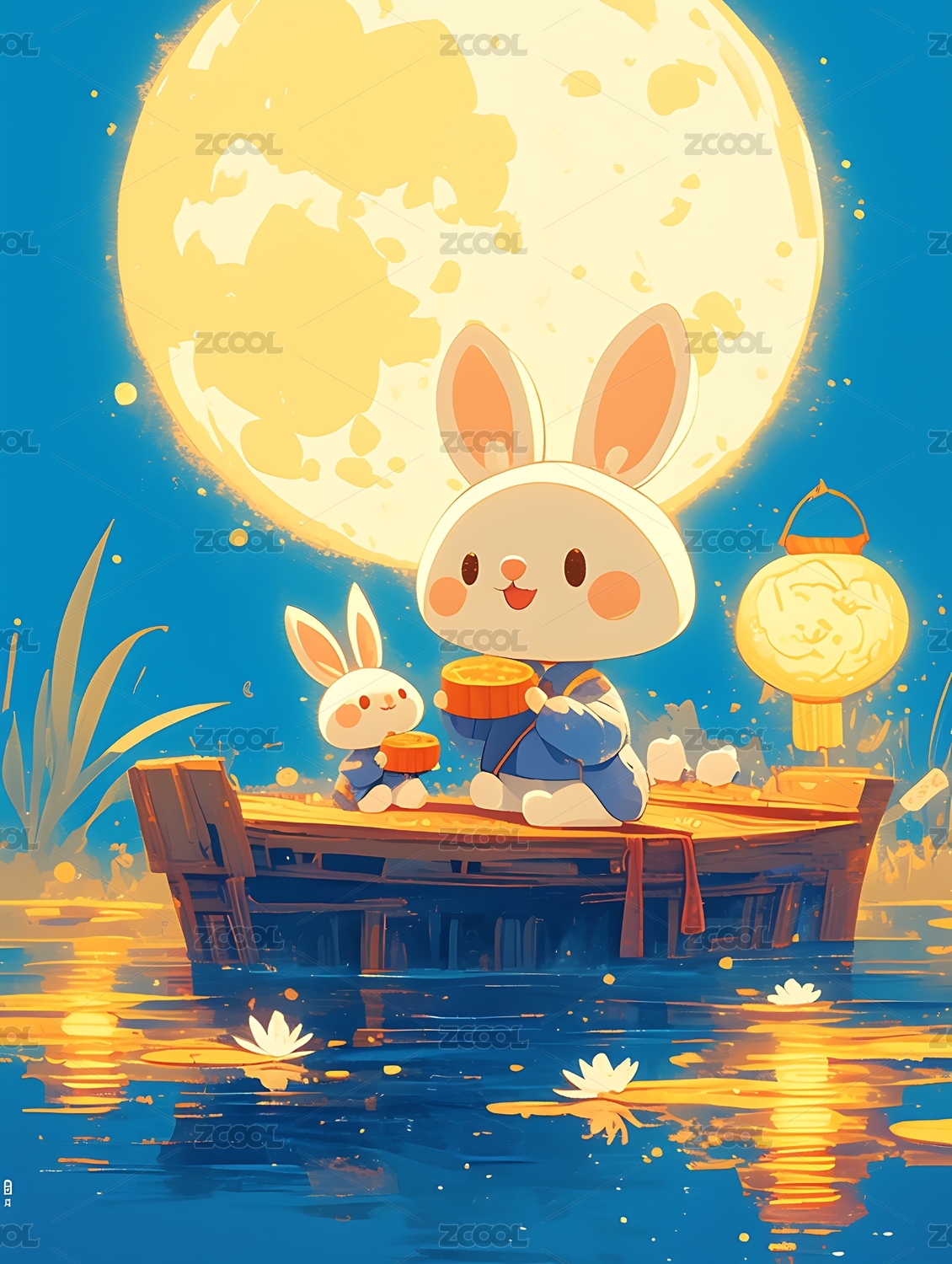 玉兔,小船,月亮,云朵,灯笼,月饼,花朵,中秋,节日,夜晚