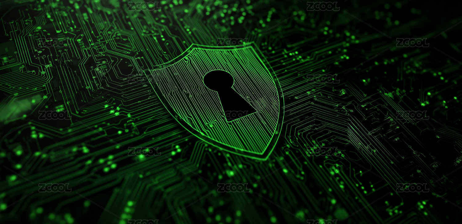 绿色电路板上的安全盾牌锁背景图