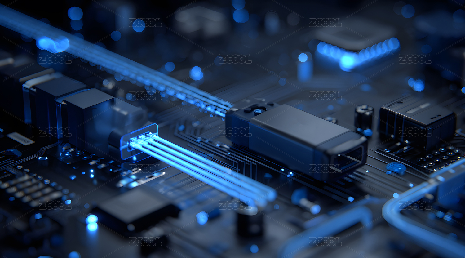 电路板上发光蓝色元件的科技场景图