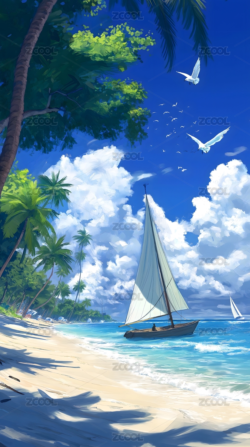 新海诚风格交通工具帆船在海上日漫卡通插画