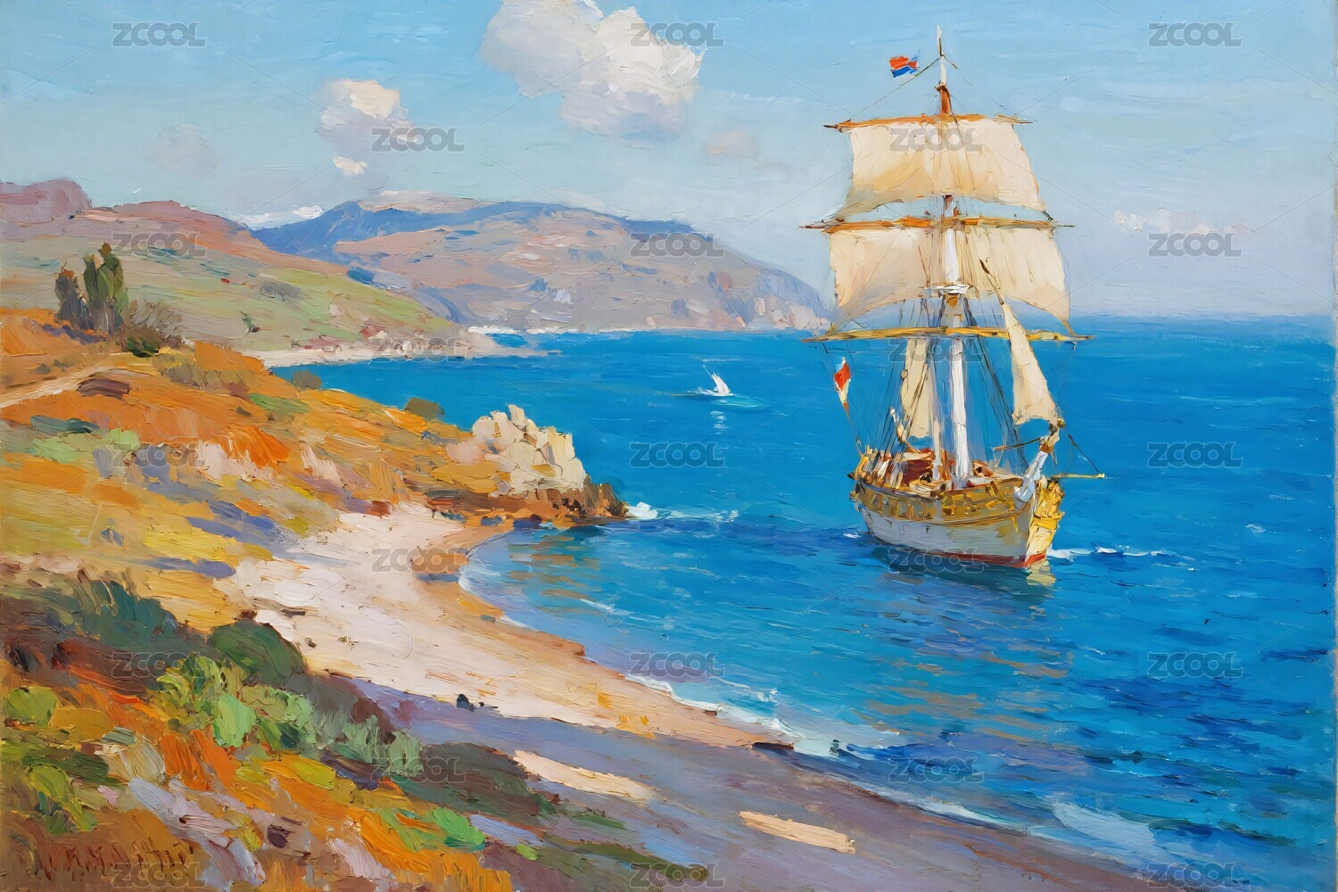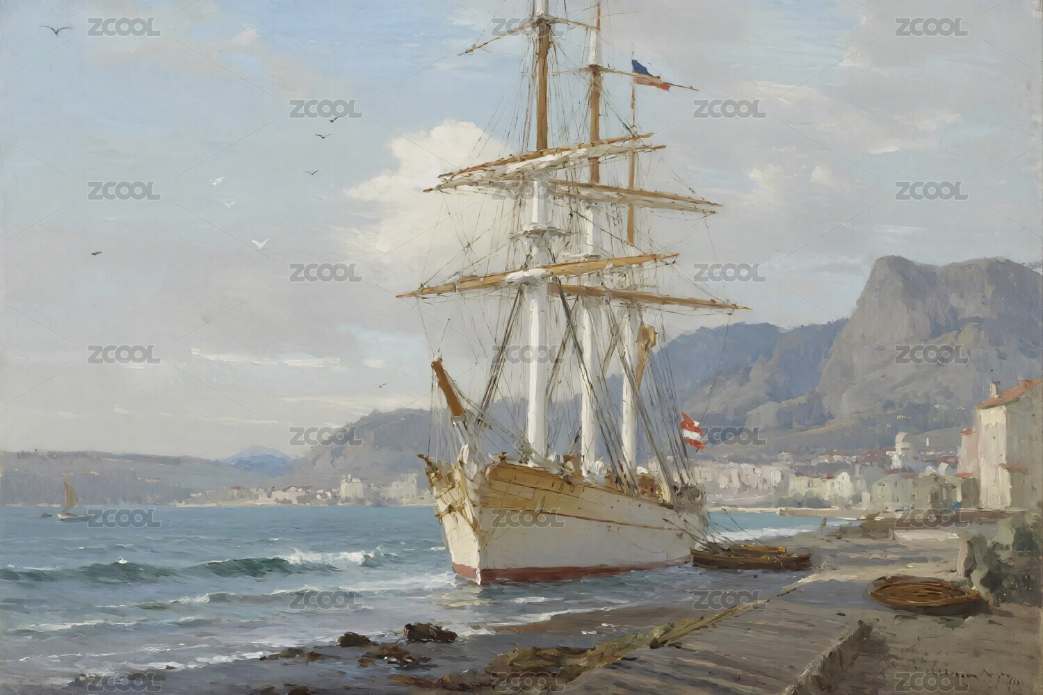 帆船,海面,海岸,山丘,房屋,树木,绘画,风景,插画,艺术