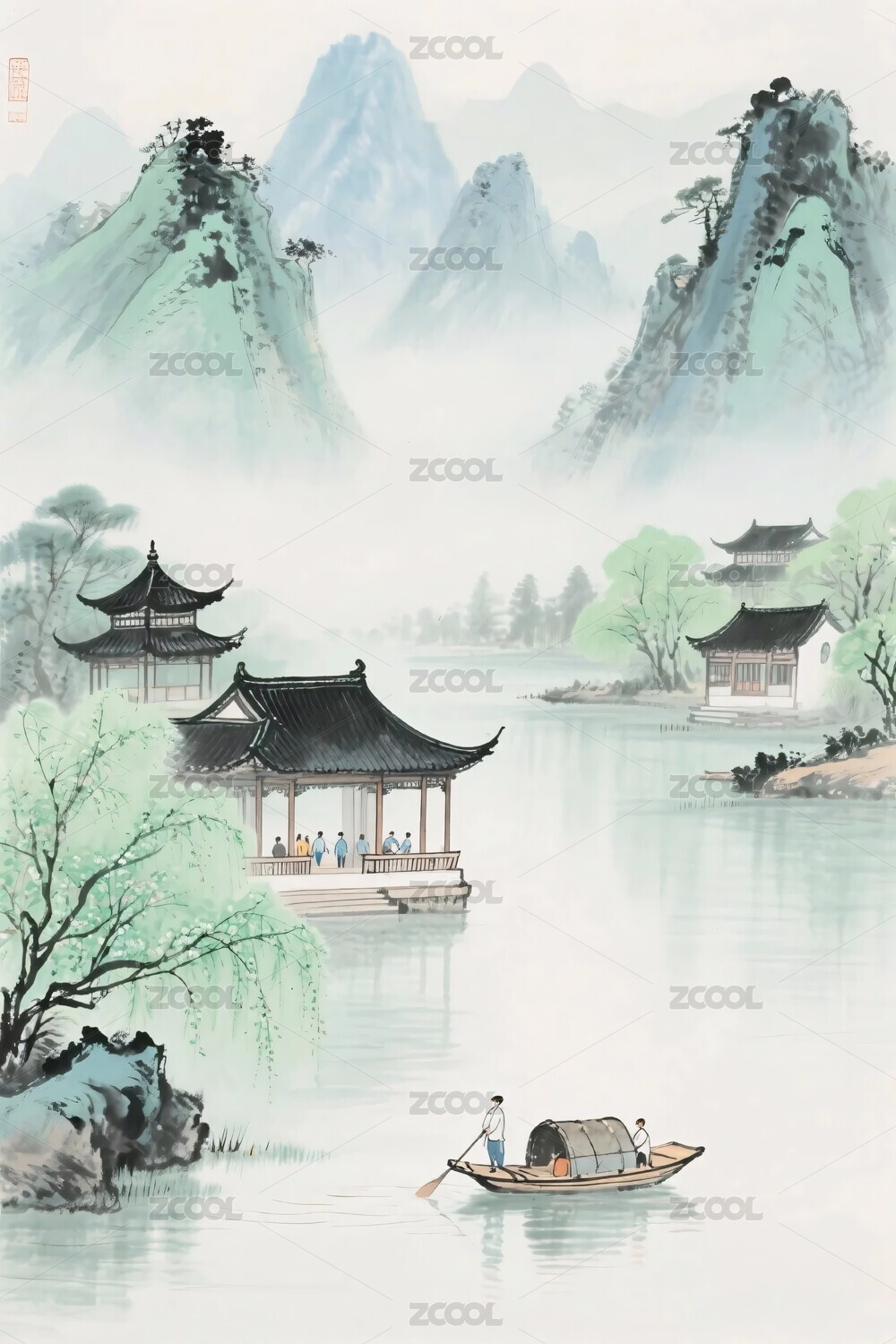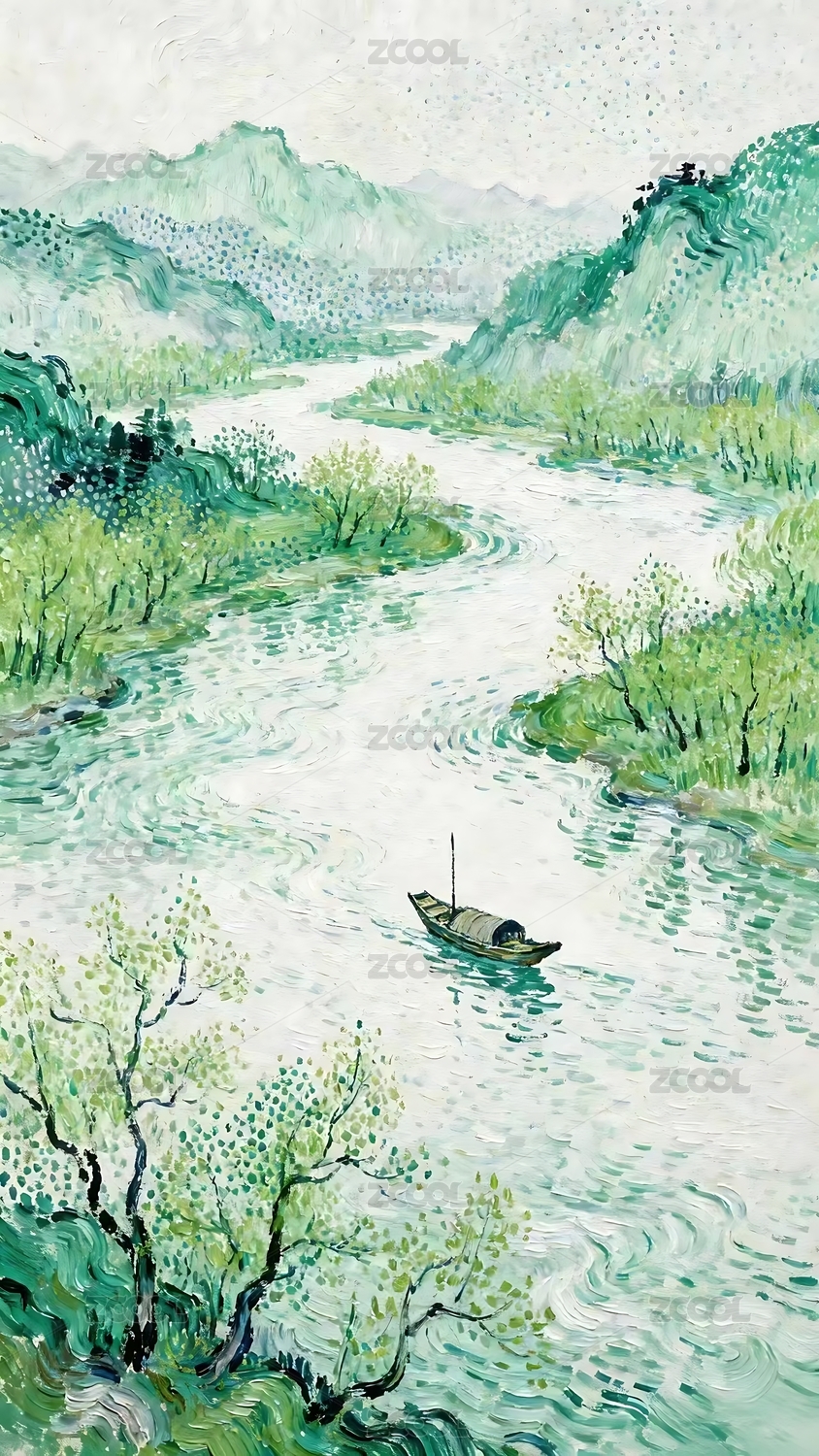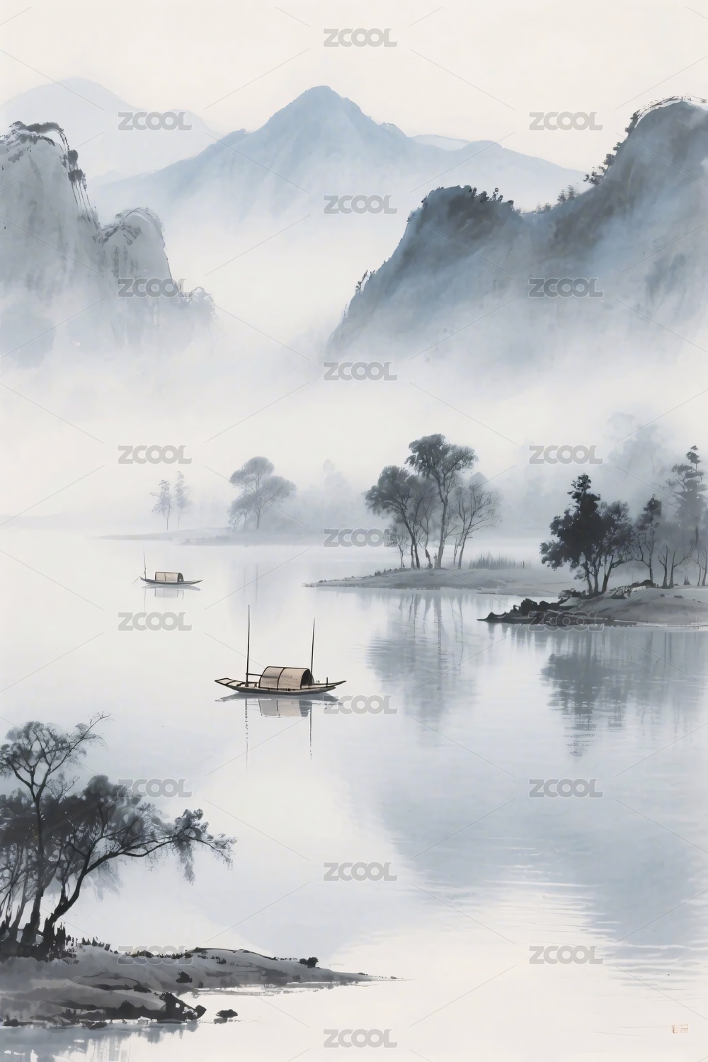 小船,江水,树木,山水,中式,水墨画,风景,静谧,自然,绿色