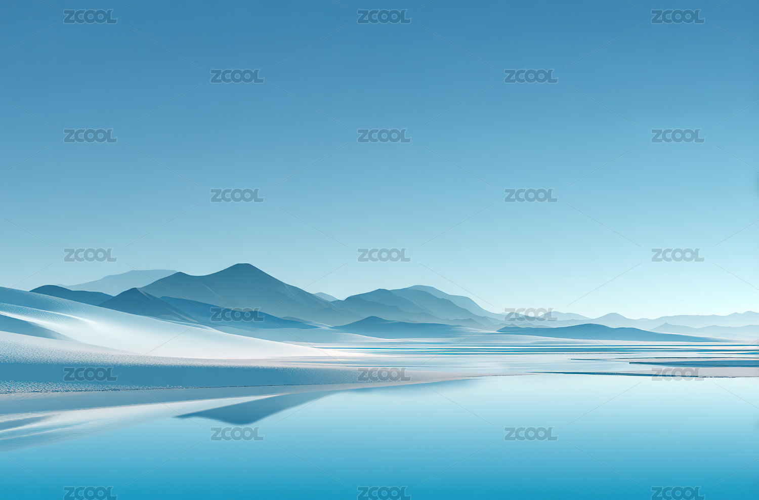 三维渲染起伏沙丘天空水面倒影