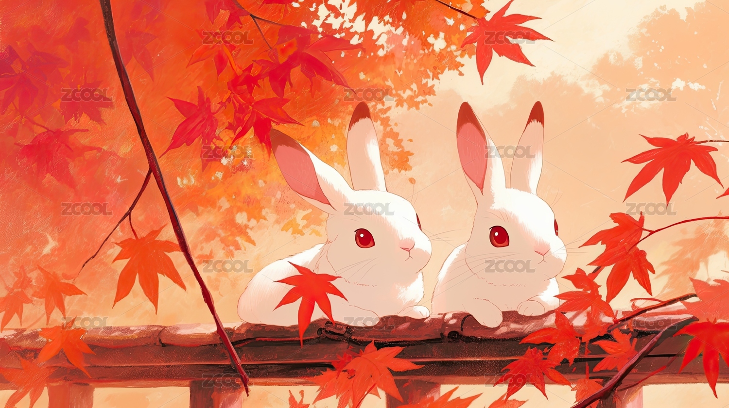 白兔,森林,秋日,落叶,插画,卡通,动物,自然,风景,温馨