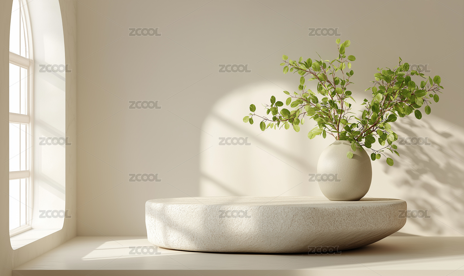 镜子,圆形,植物,绿色,搁板,木质,浅色,白墙,背景,简洁