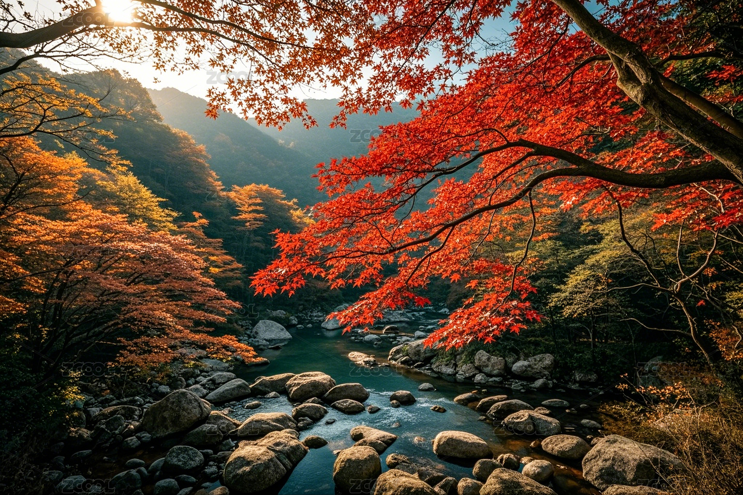 溪流,山林,红叶,秋景,自然,风景,真实摄影,美景,雾气,岩石