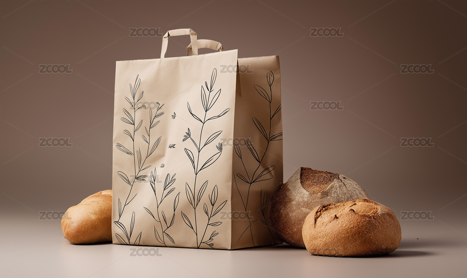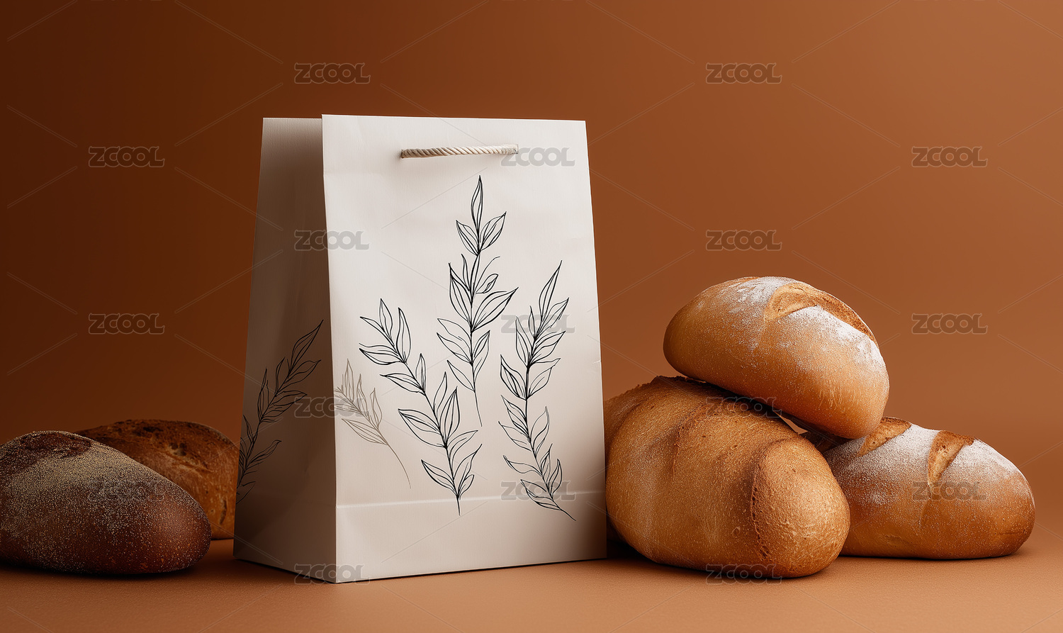 纸袋,叶纹,面包,麦穗,棕色,背景,烘焙,自然,质朴,简约