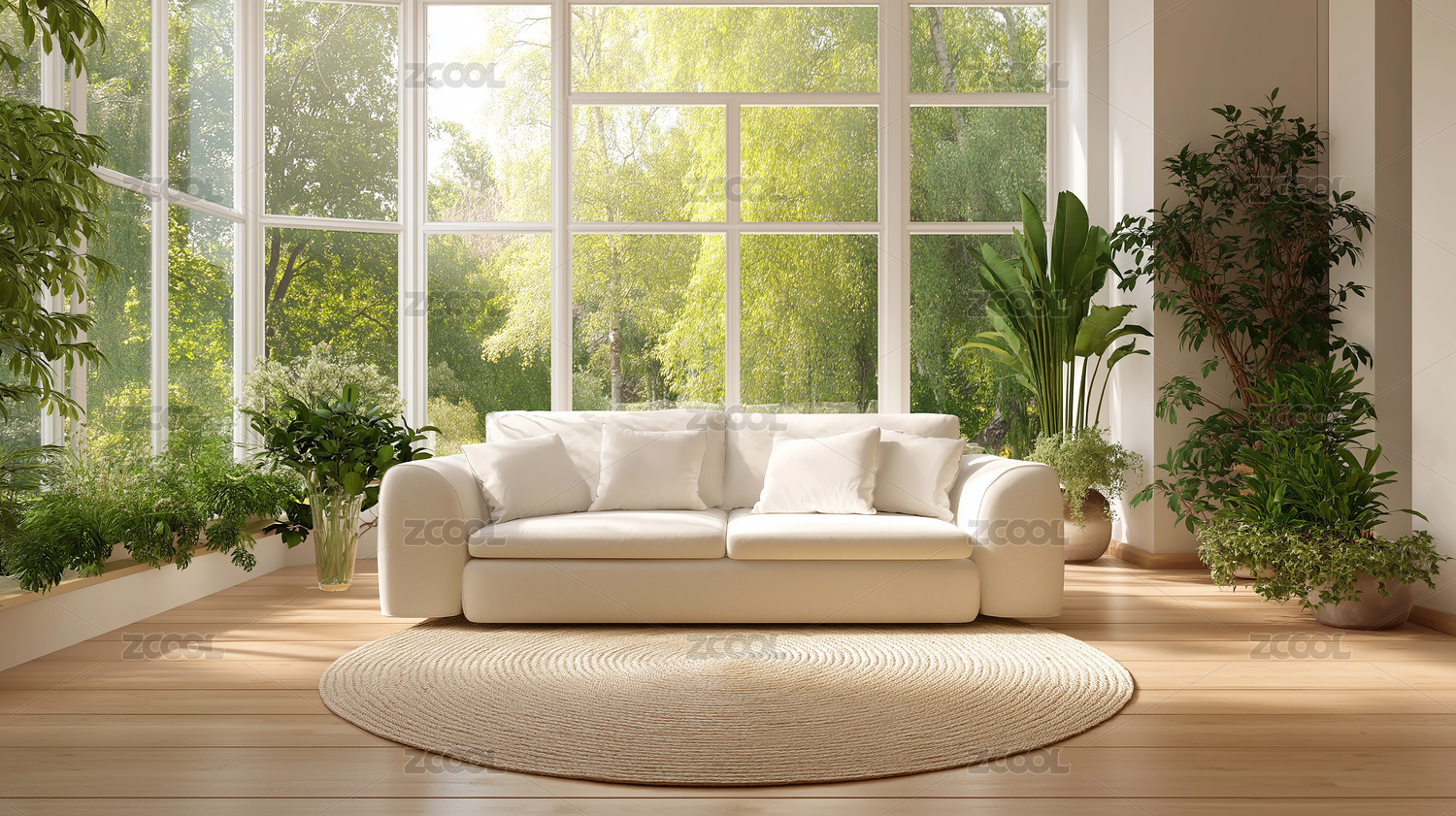 客厅,大窗,绿植,白沙发,绿抱枕,自然,清新,简约,现代,家居