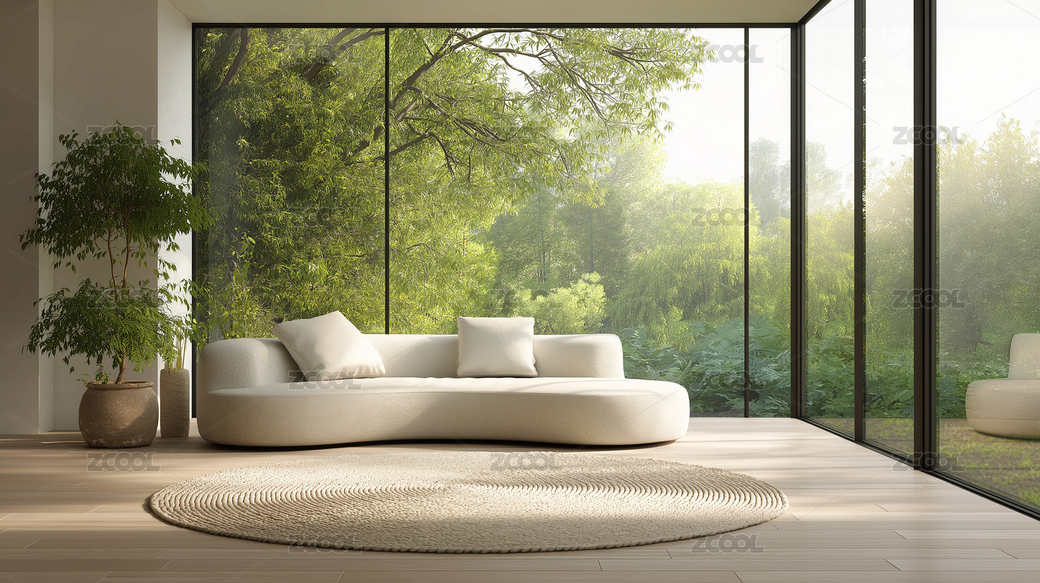 全景窗客厅连通自然绿意空间
