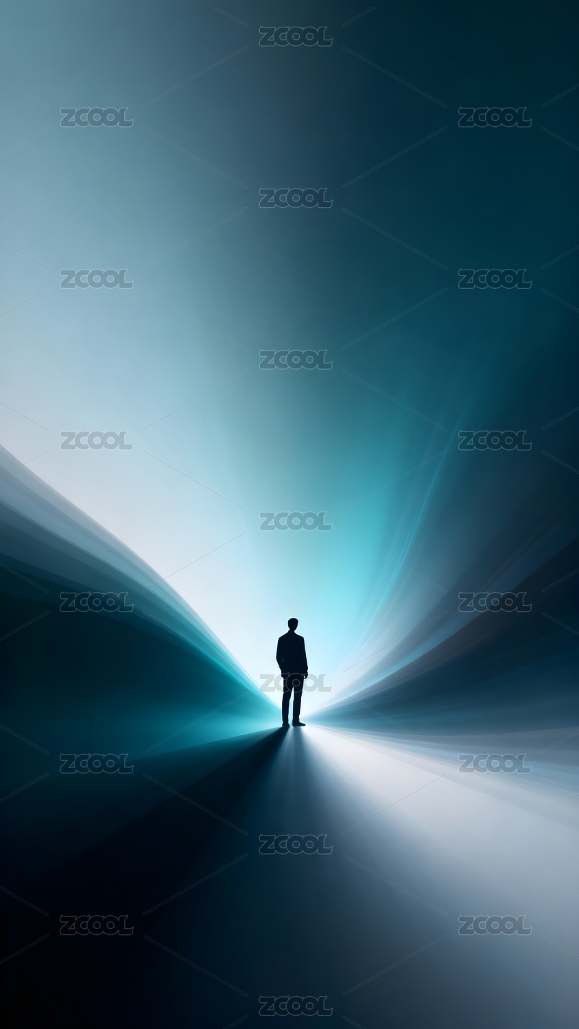 孤独身影立于蓝绿渐变光海之中