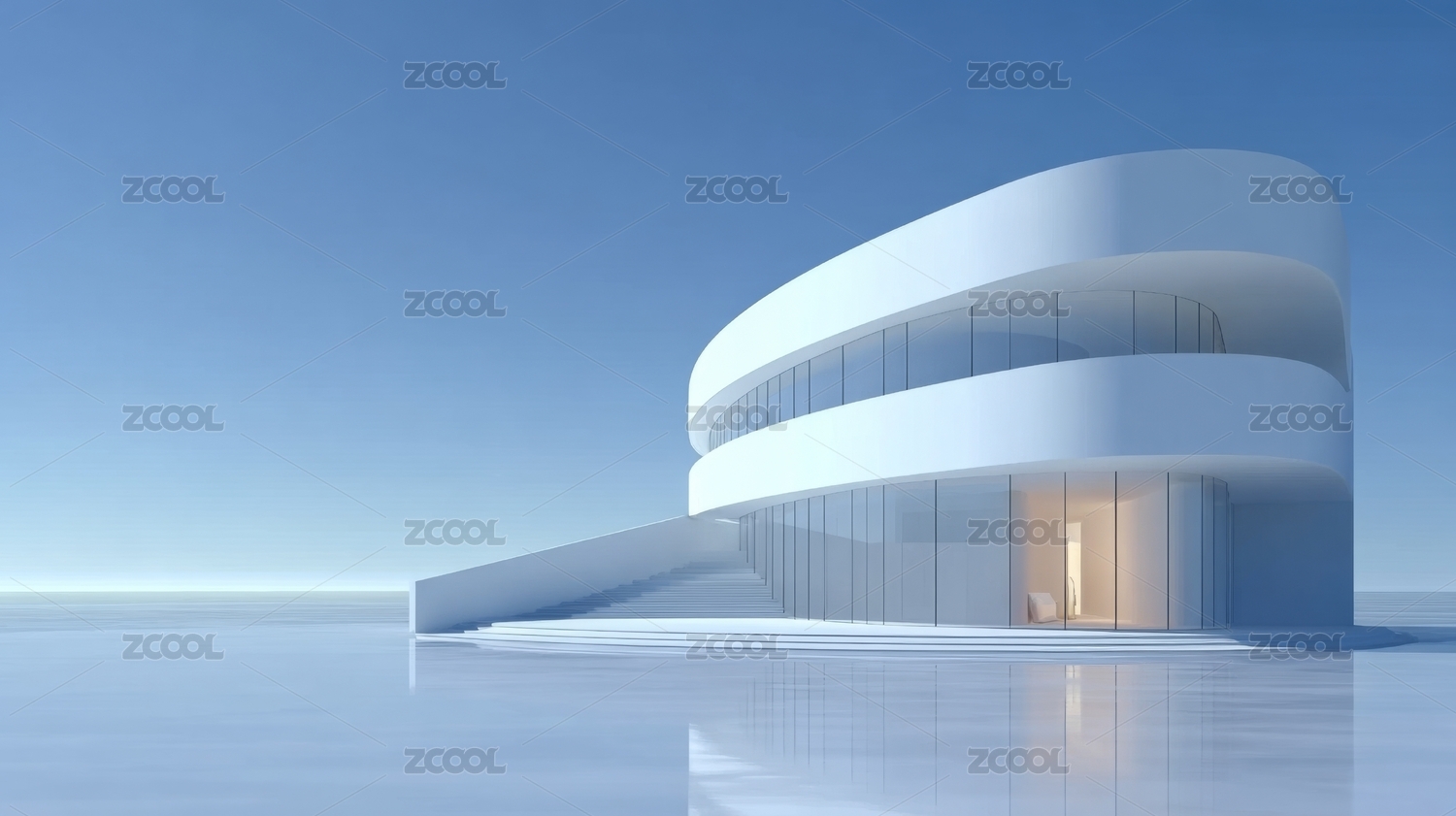 现代,简约,建筑,圆形,大窗,白色,平顶,玻璃,天际线,未来感