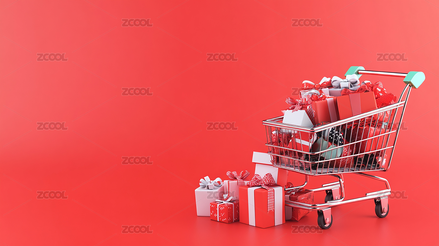 红色背景下购物车上的礼物特写