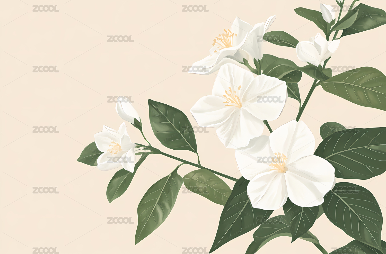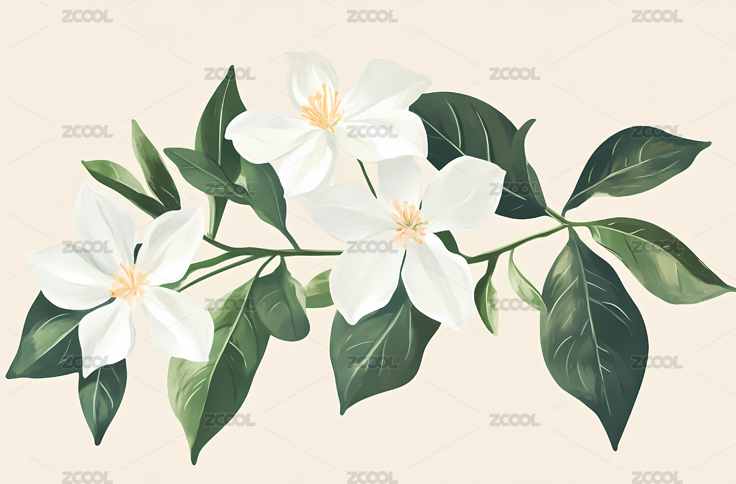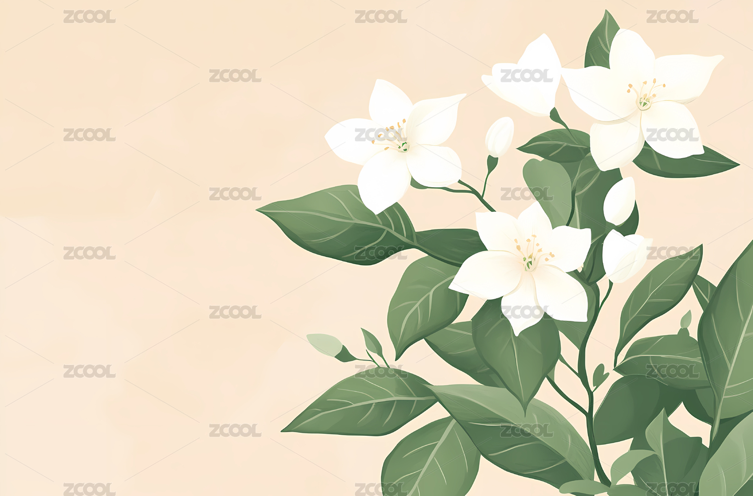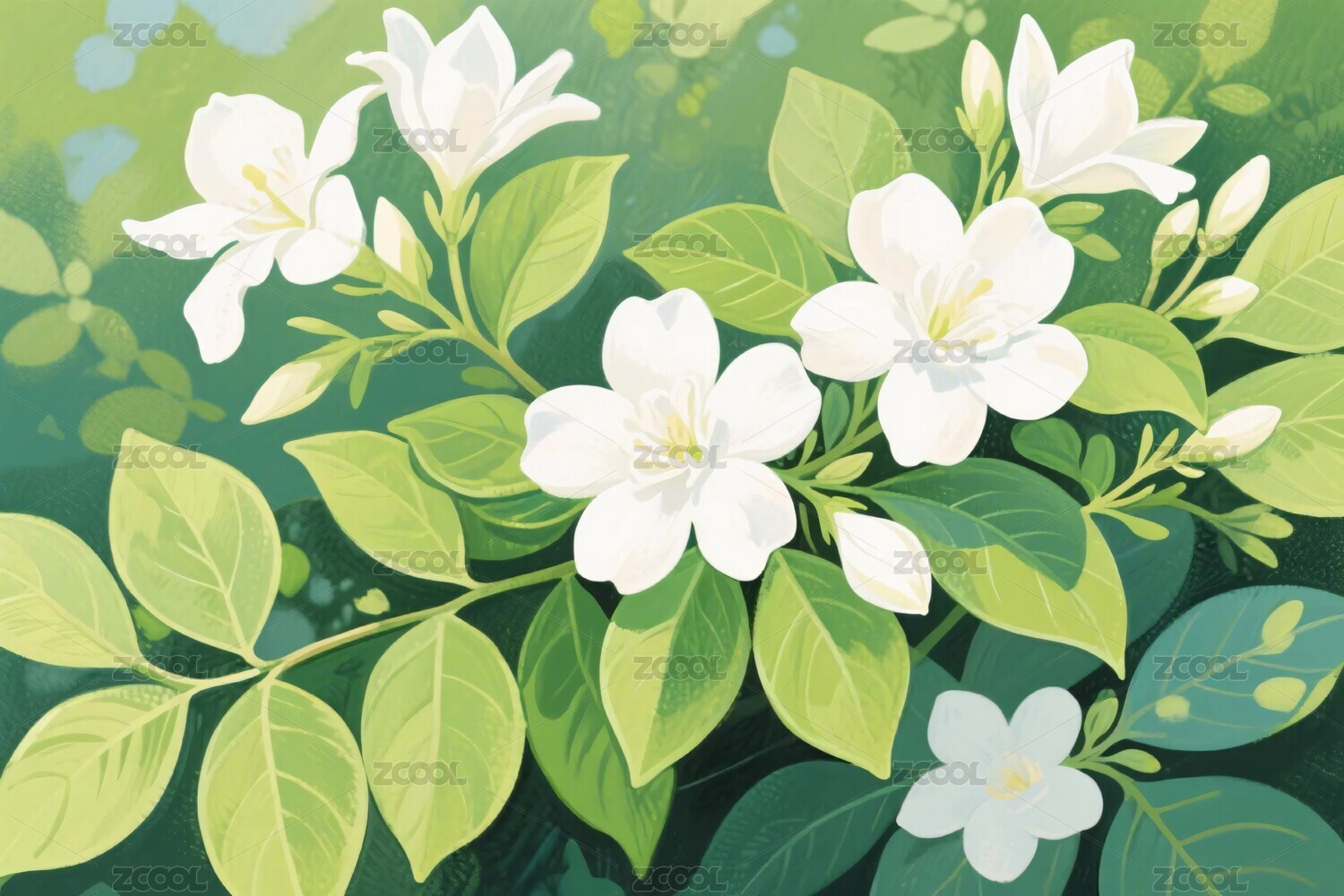 茉莉花,花朵,绿色,叶子,黄色,背景,清新,自然,植物,插画