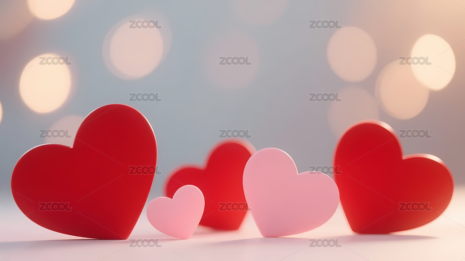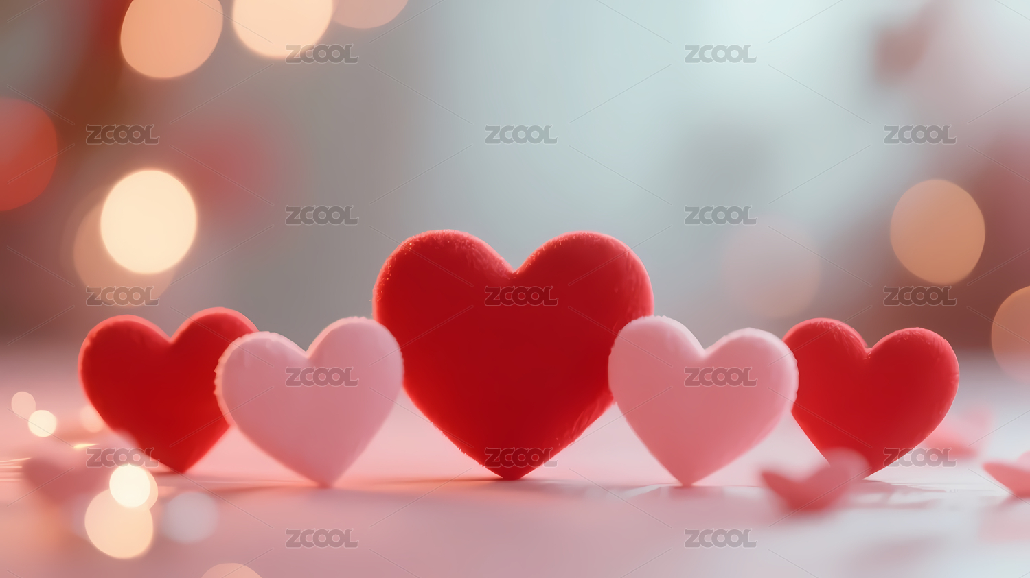 四个红色绒面质感心形漂浮在柔和米色背景上