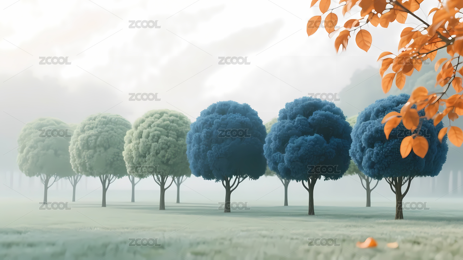 背景,蓝色,绿色,天空,橙色,形态,树木,雾气,淡黄,朦胧