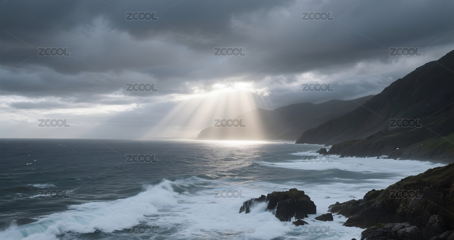 乌云密布下阳光穿透云层照耀海面