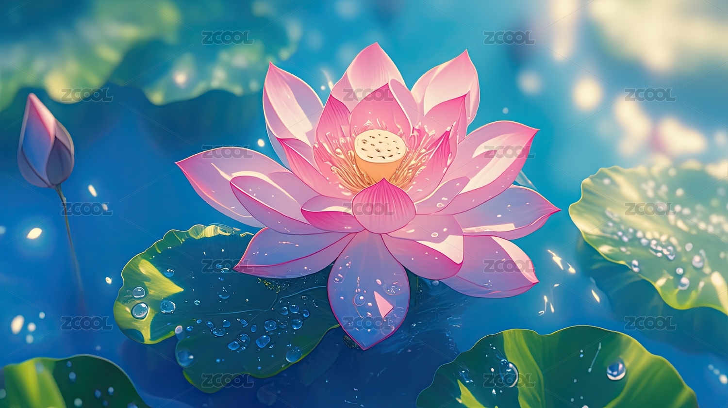 魔法发光睡莲水塘中美丽的荷花和绿叶的特写