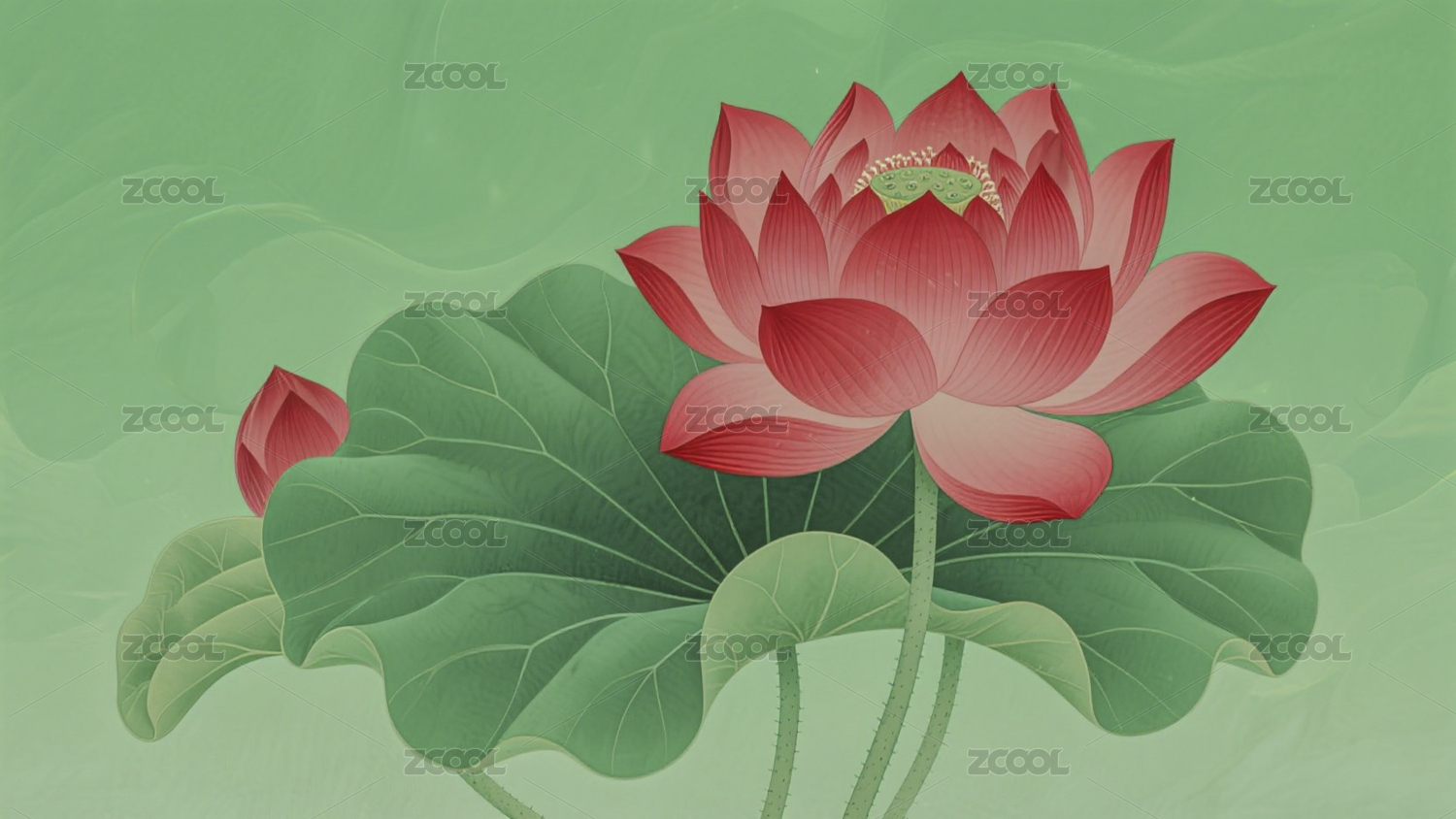 荷花荷叶浅绿色绢笔画