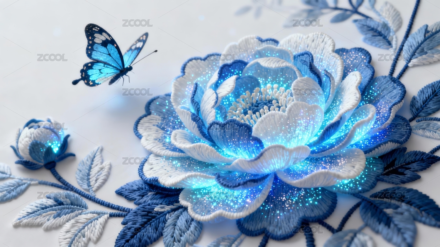刺绣蝴蝶牡丹蓝白工艺装饰场景