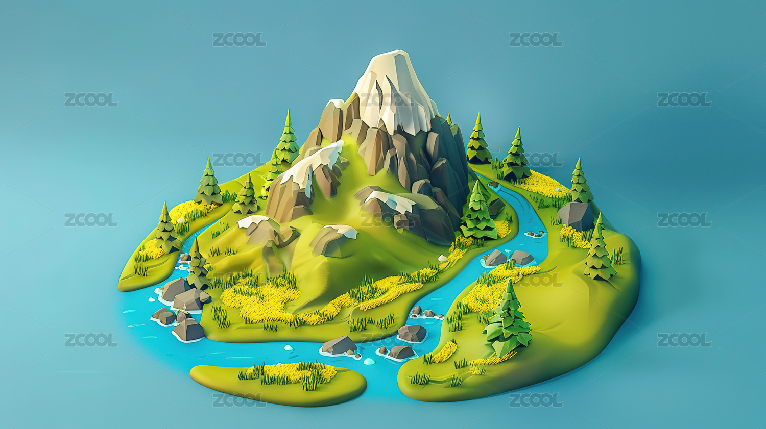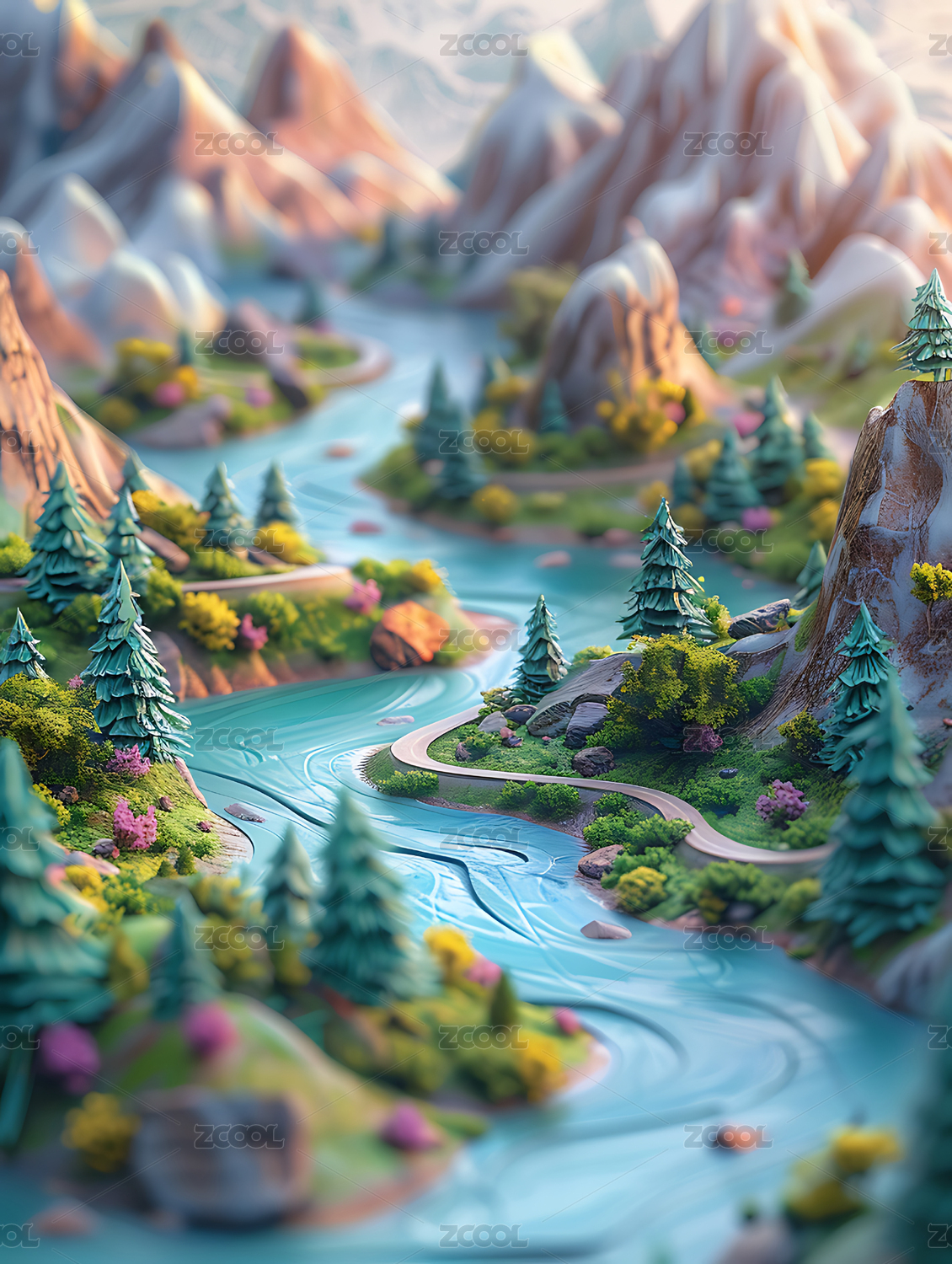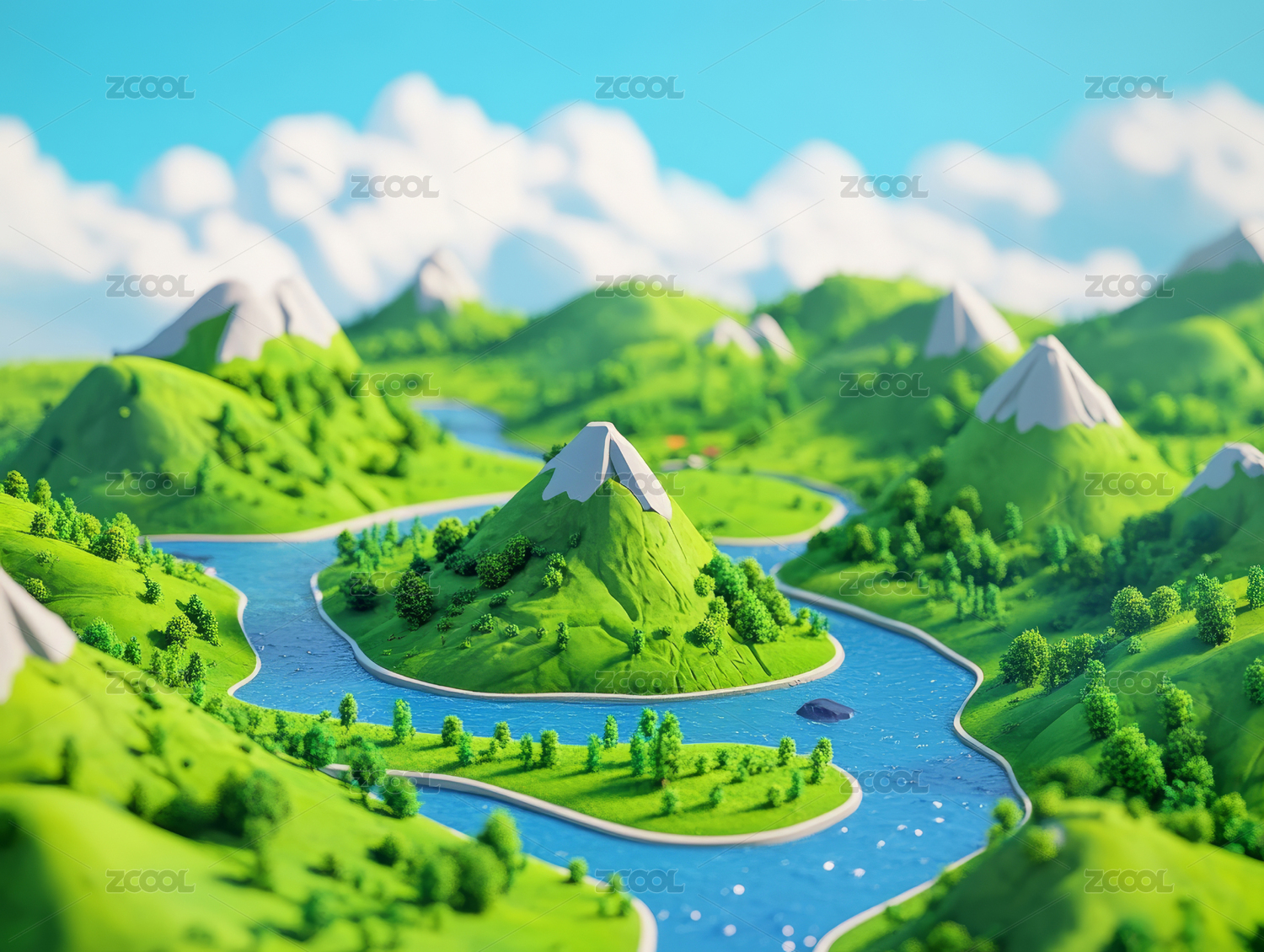 航拍视角蜿蜒的河流绿色的山脉3D插画