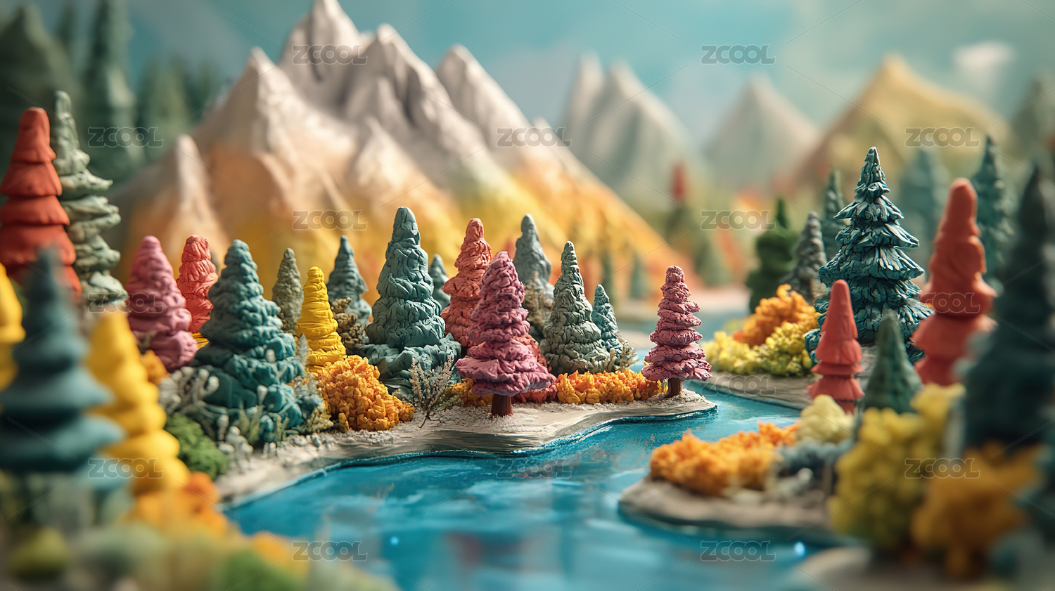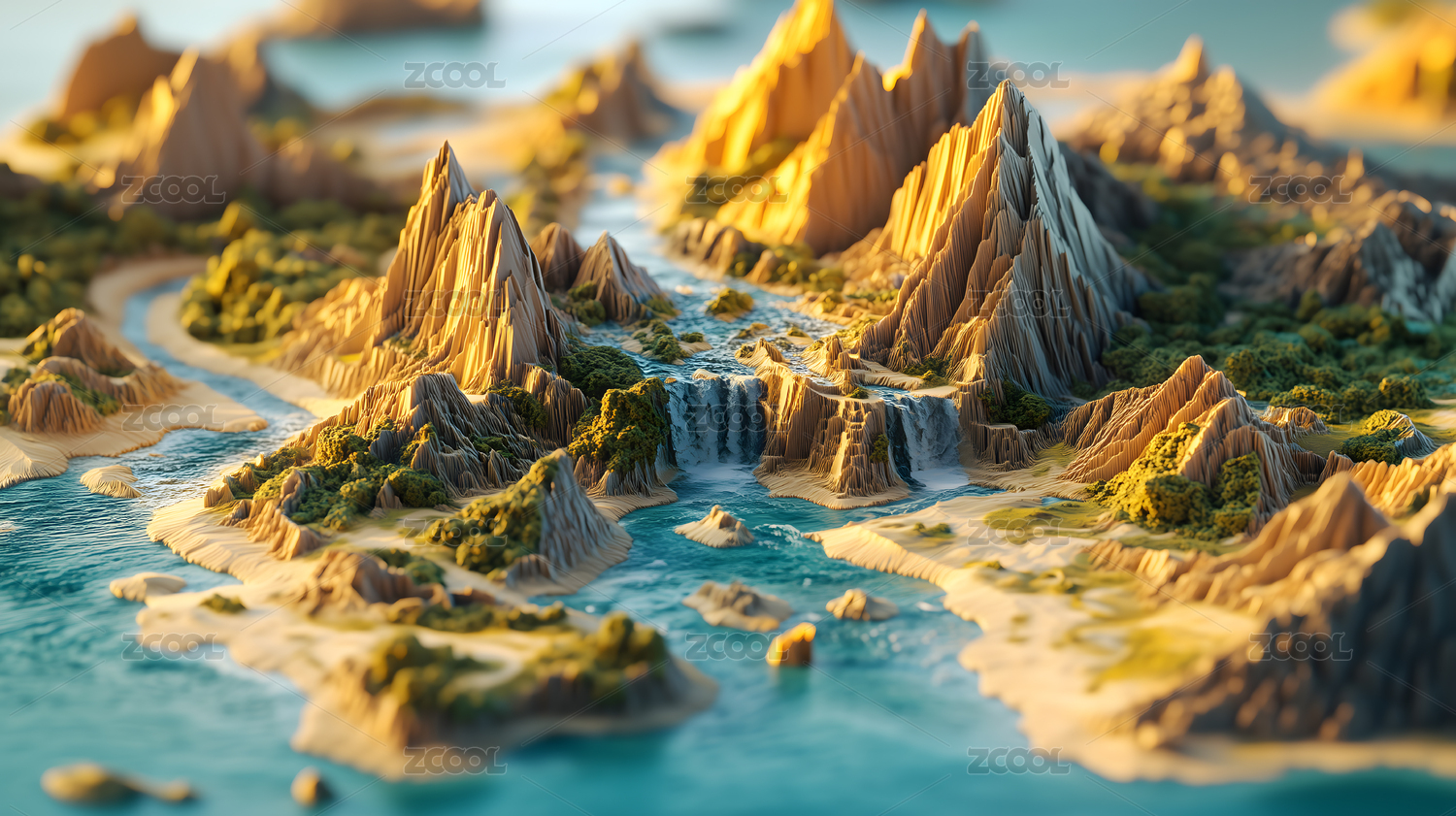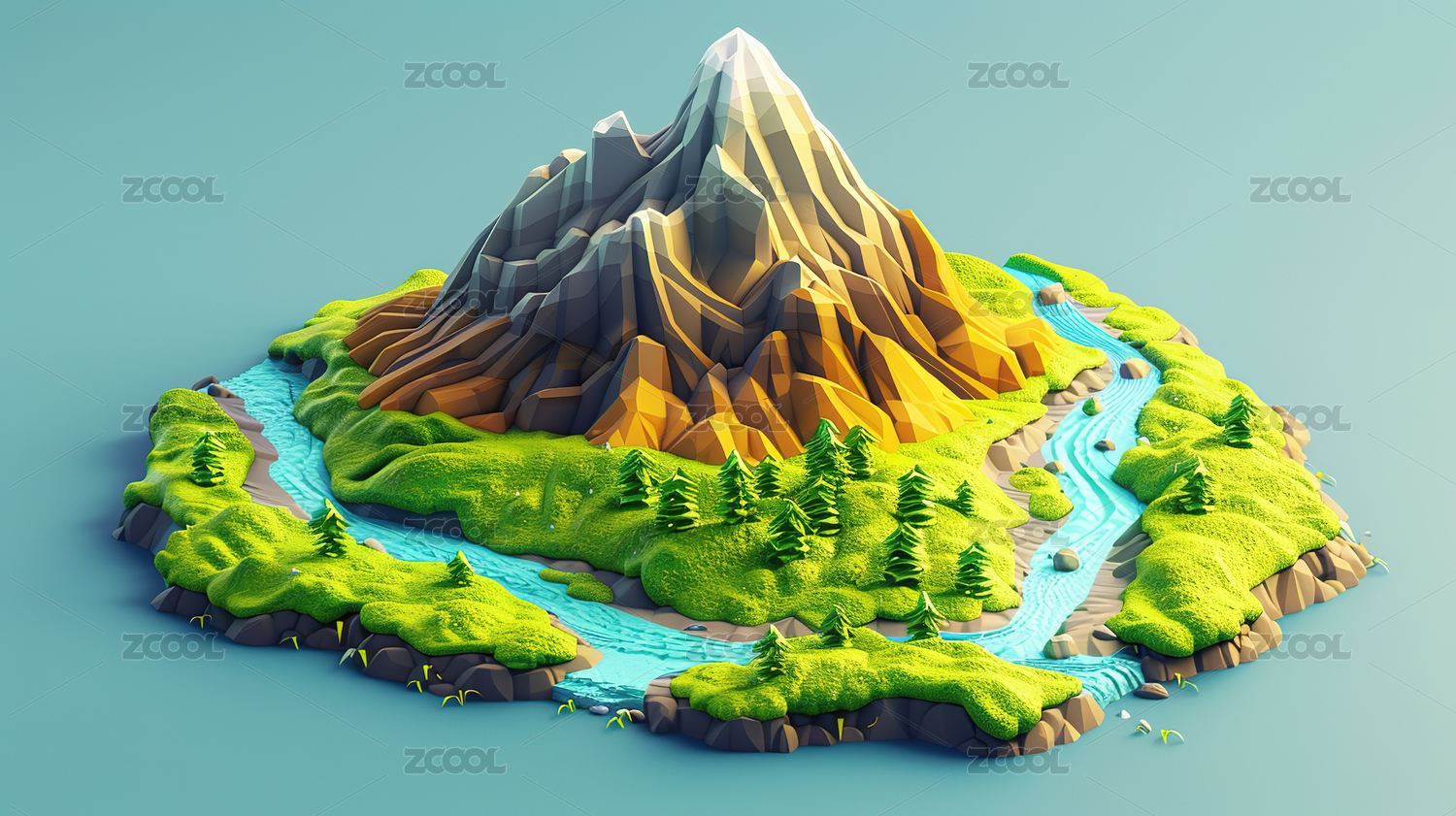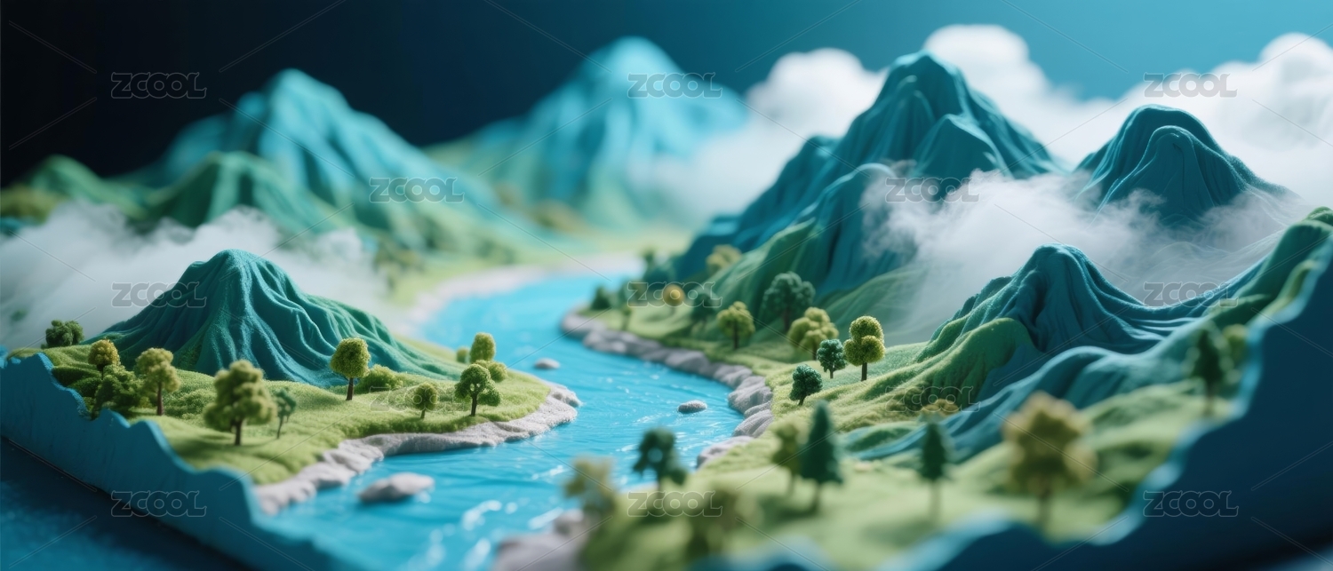航拍视角蜿蜒的河流绿色的山脉3D插画