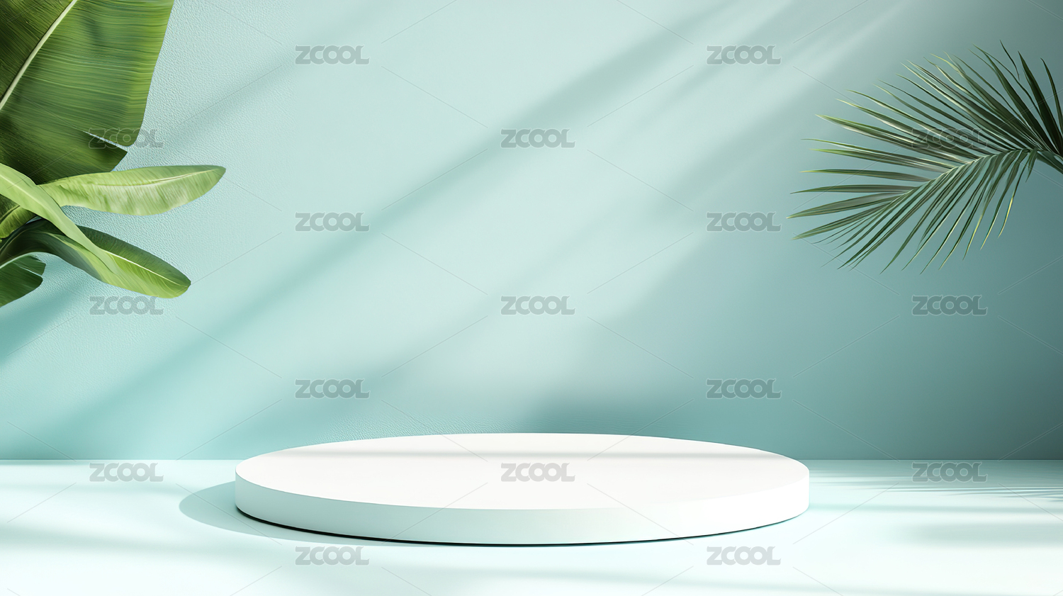 蓝色背景下的圆形展台与棕榈叶影