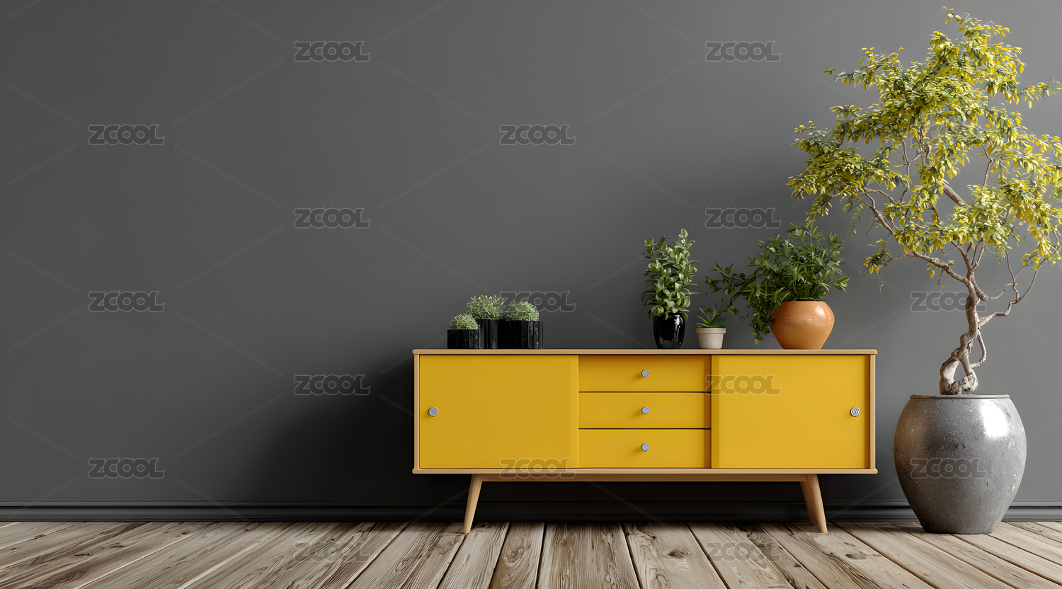 黄色柜子上摆放着多盆绿植