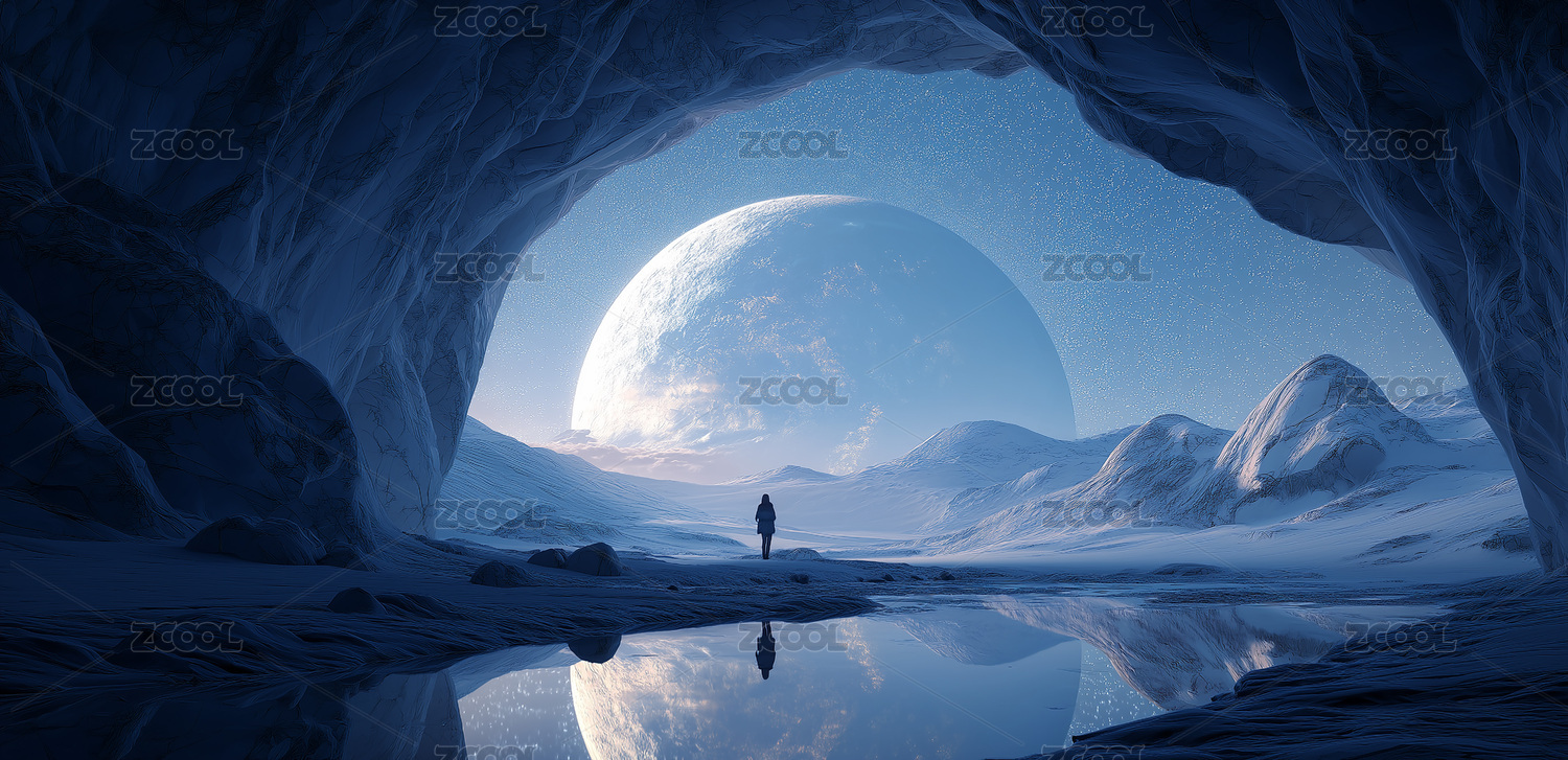 洞穴,人物,星空,雪景,科幻,场景,蓝色,冰雪,宇宙,外空