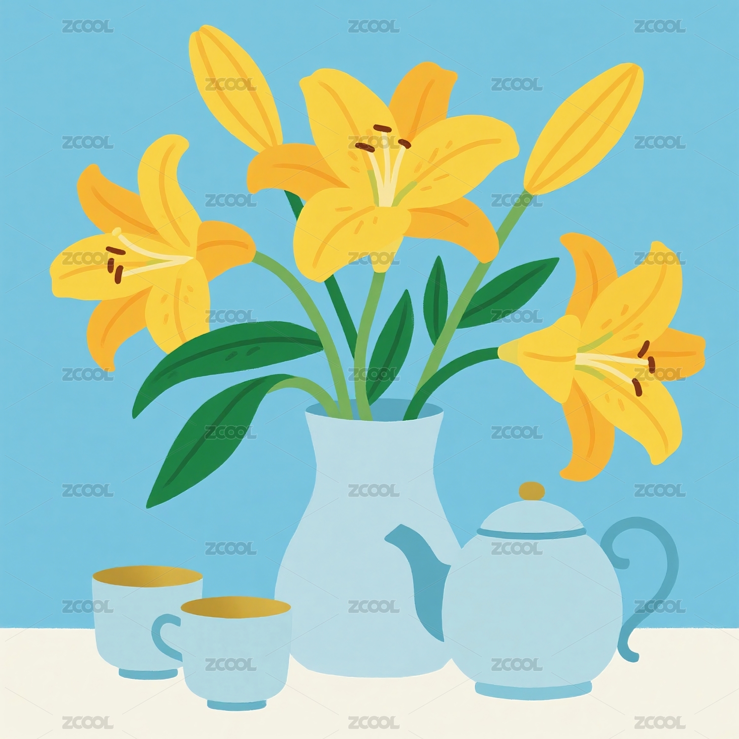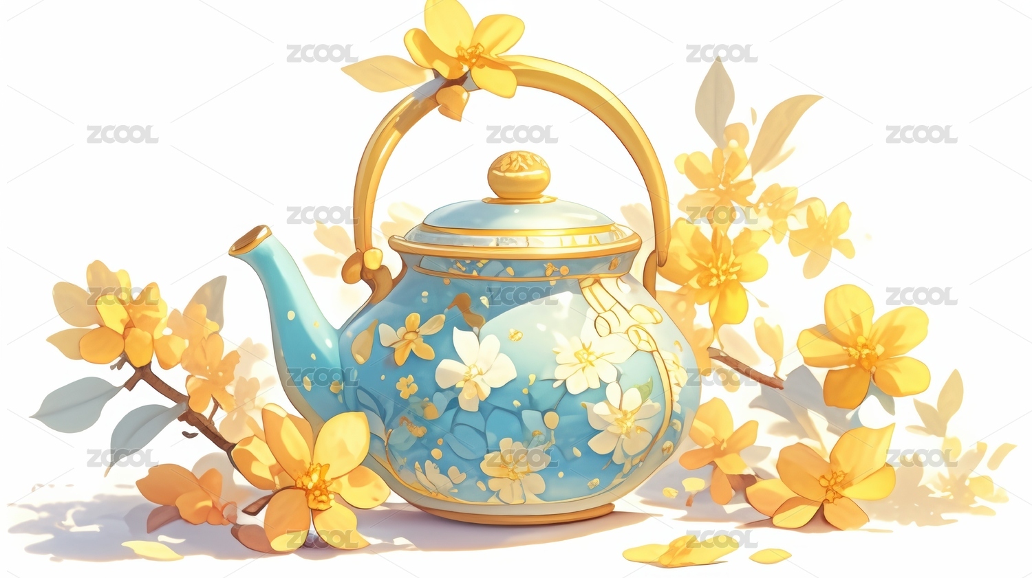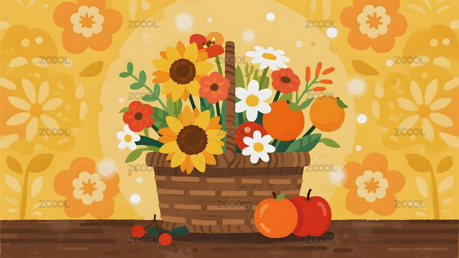 静物,水果,篮子,水壶,花卉,橘子,卡通,插画,静谧,清新