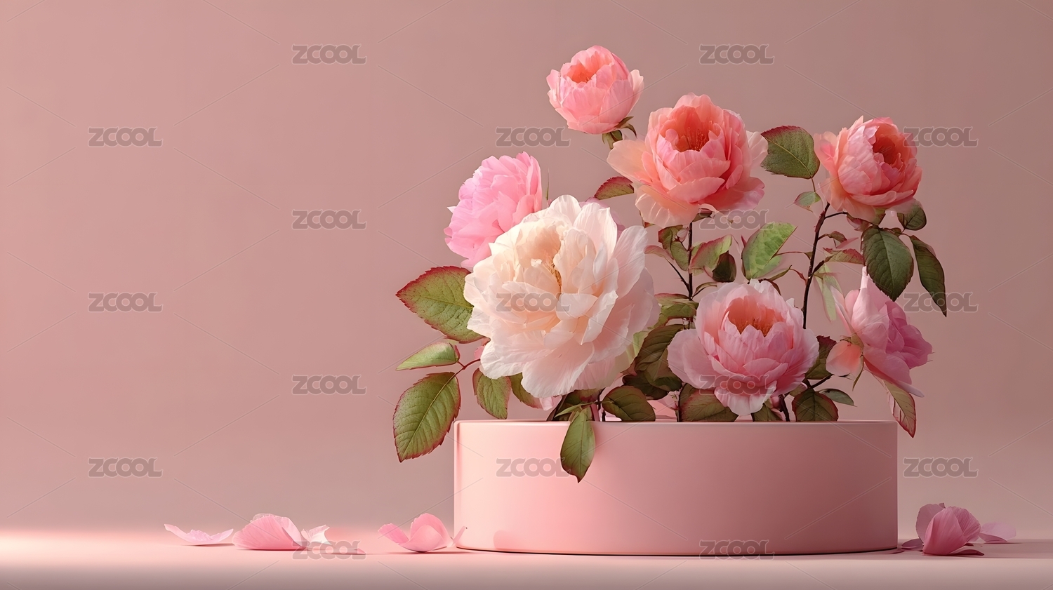 粉色玫瑰花与圆形展示台