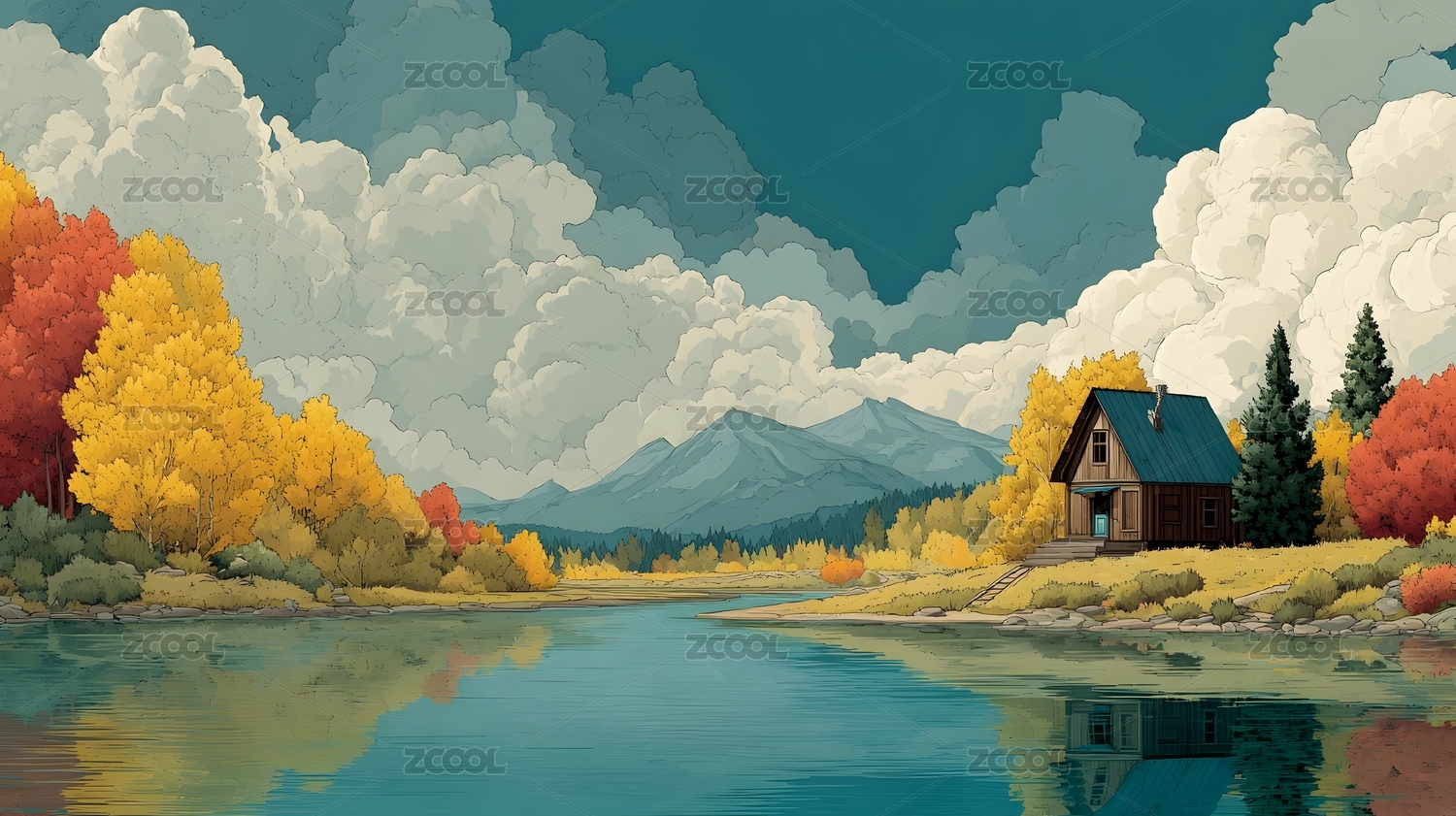 湖畔小屋与秋日风光