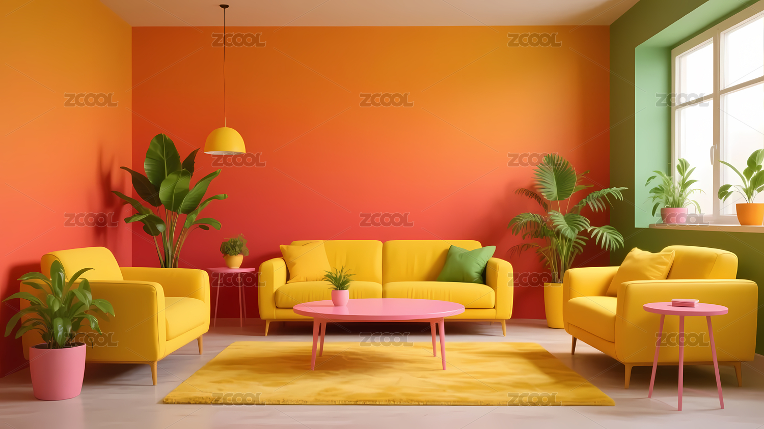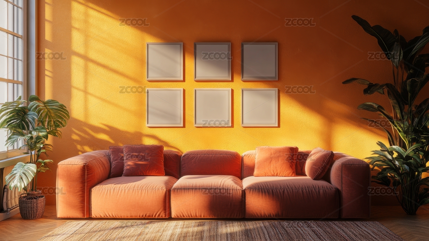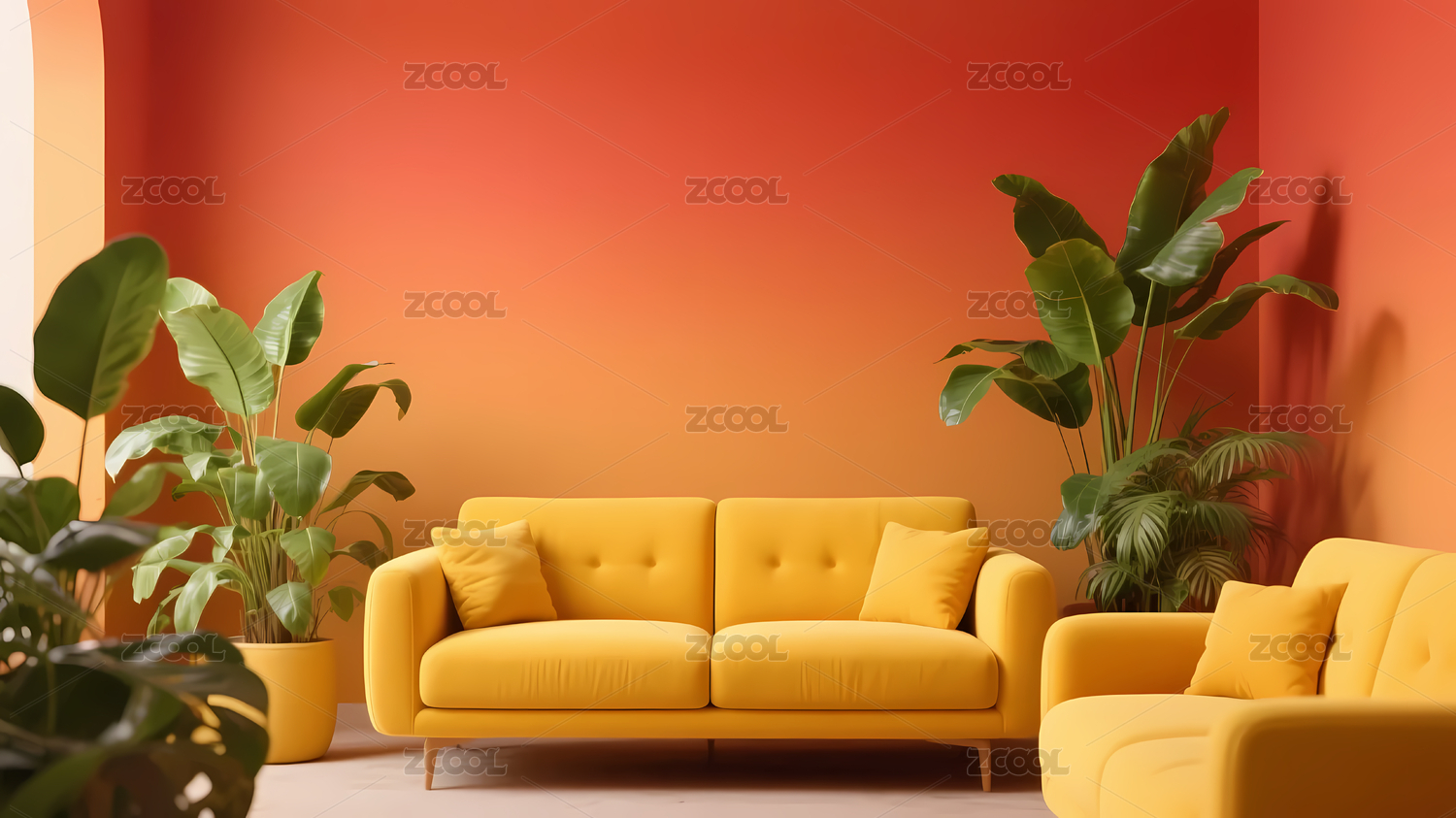 背景,橙色,黄色,绿色,窗户,植物,墙壁,沙发,自然光线,温馨