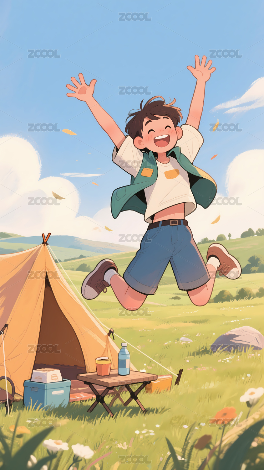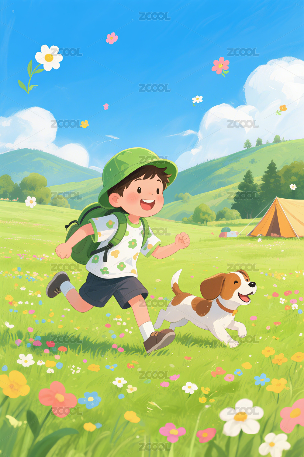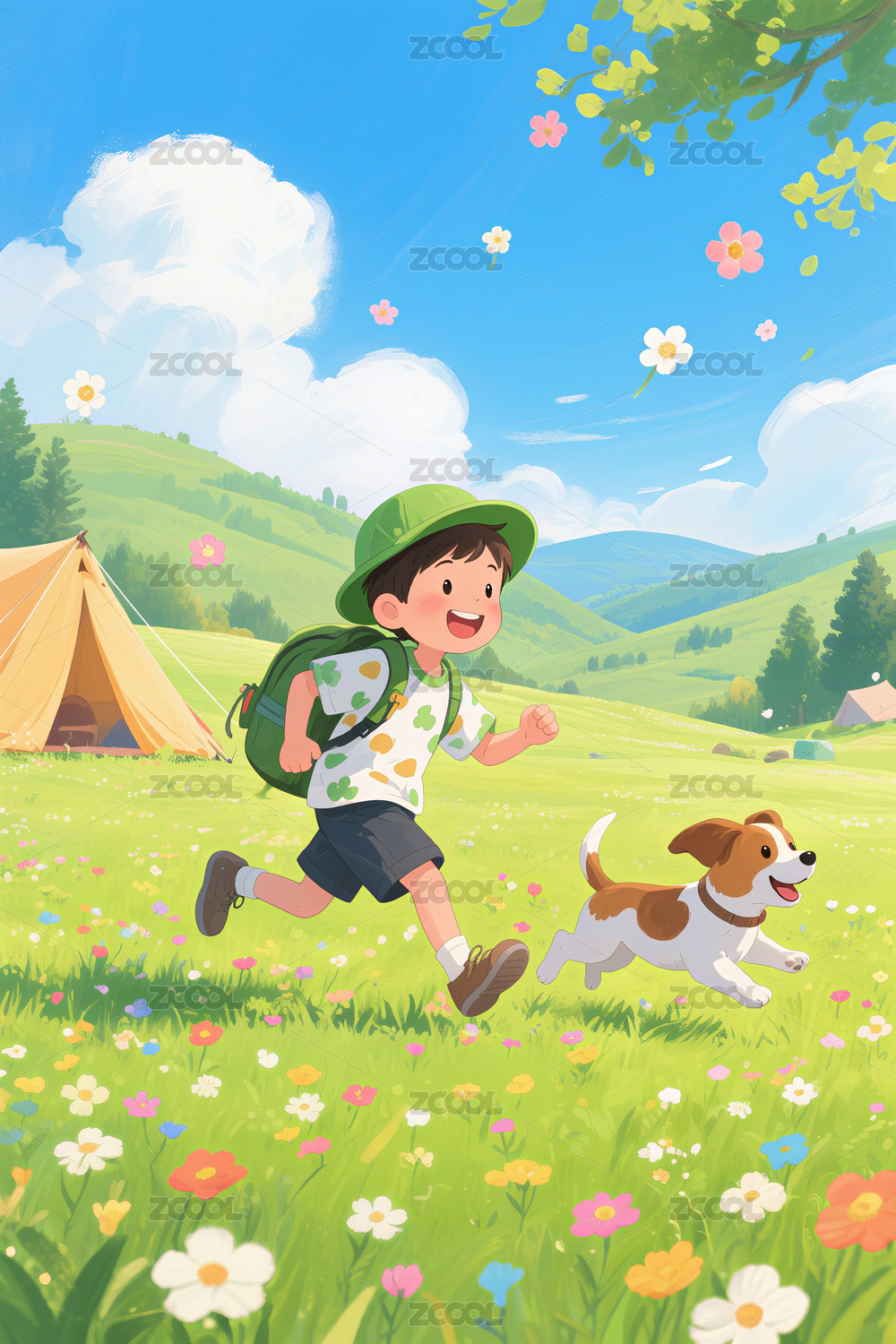 儿童,小狗,草地,蓝天,白云,露营,旅游,假期,油画,电商