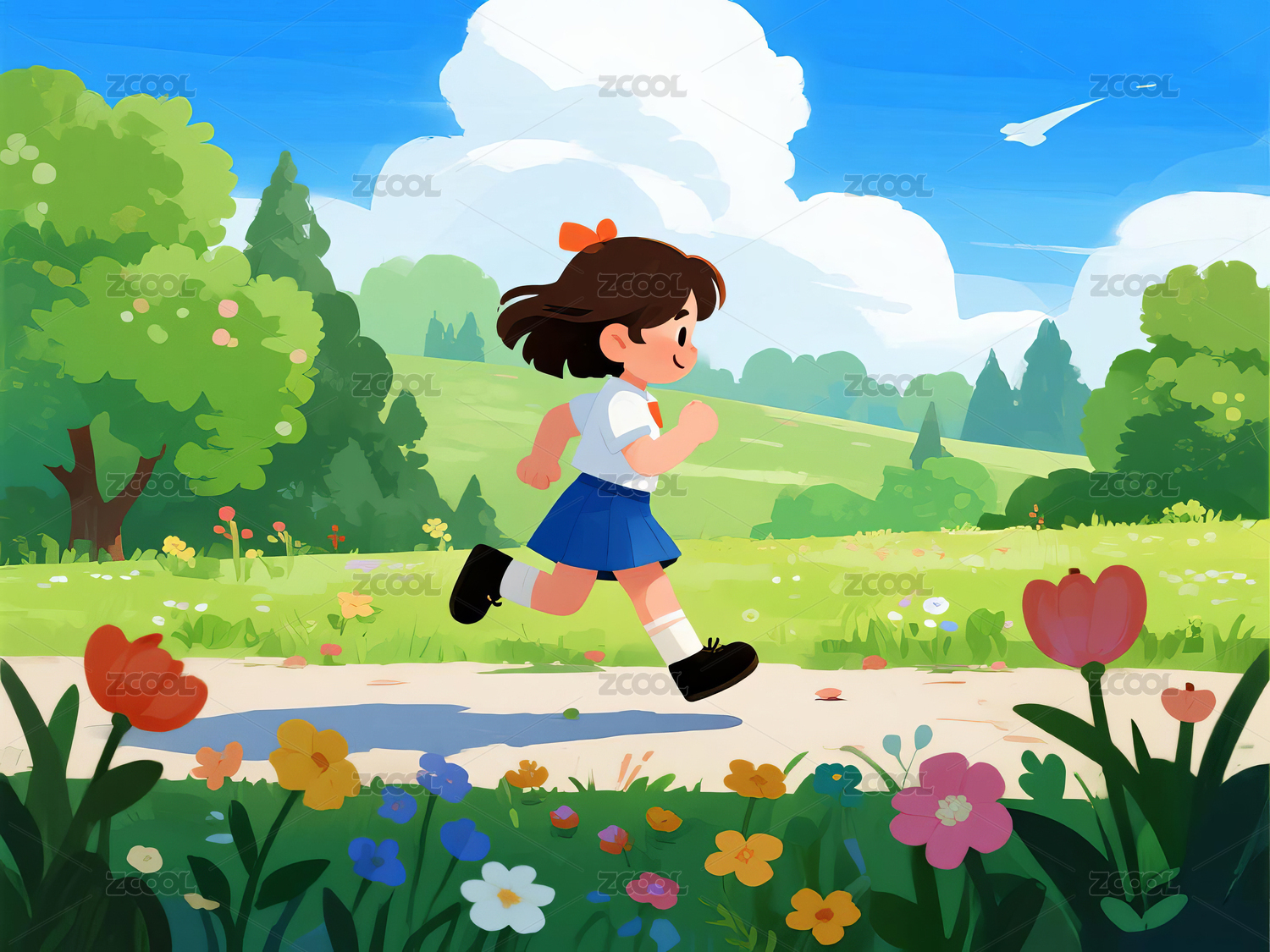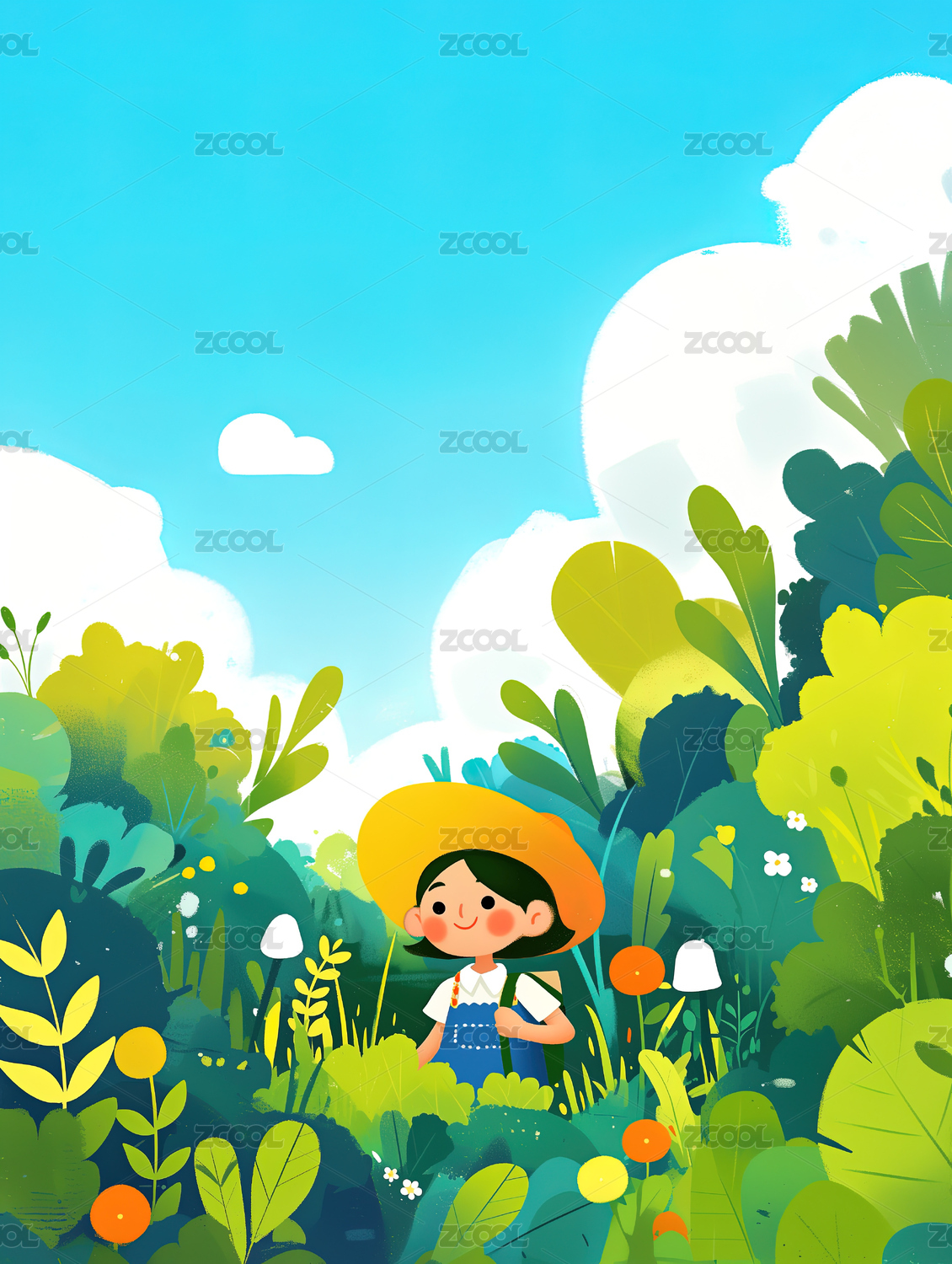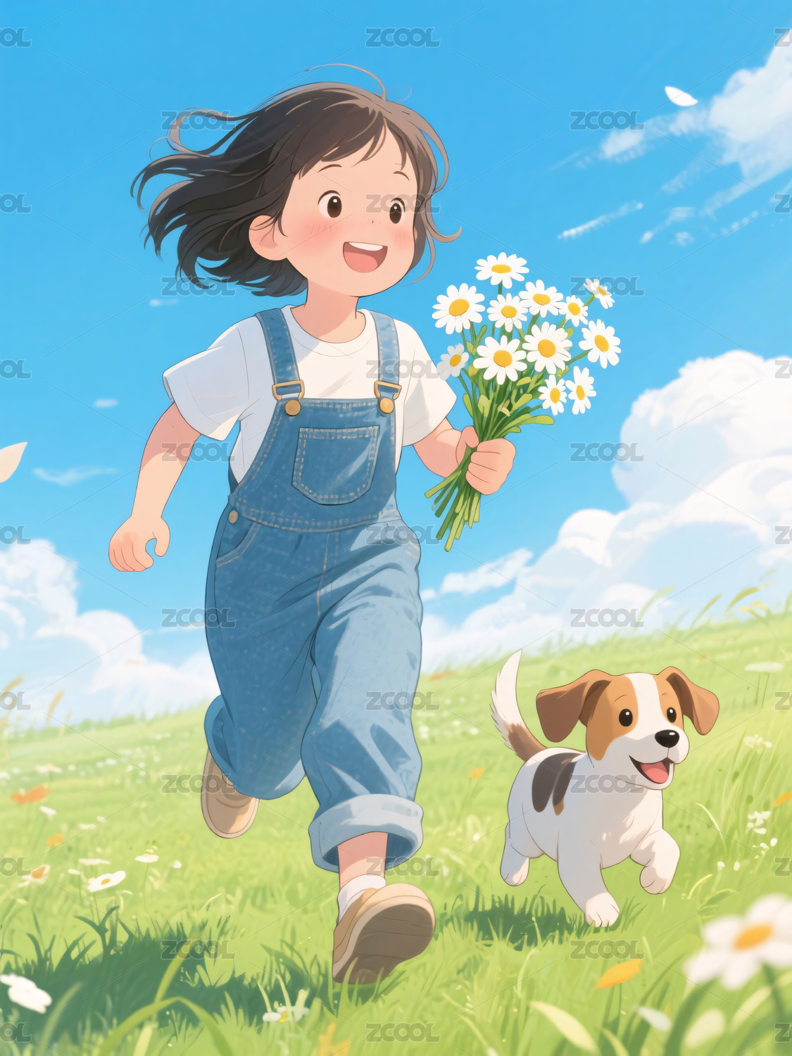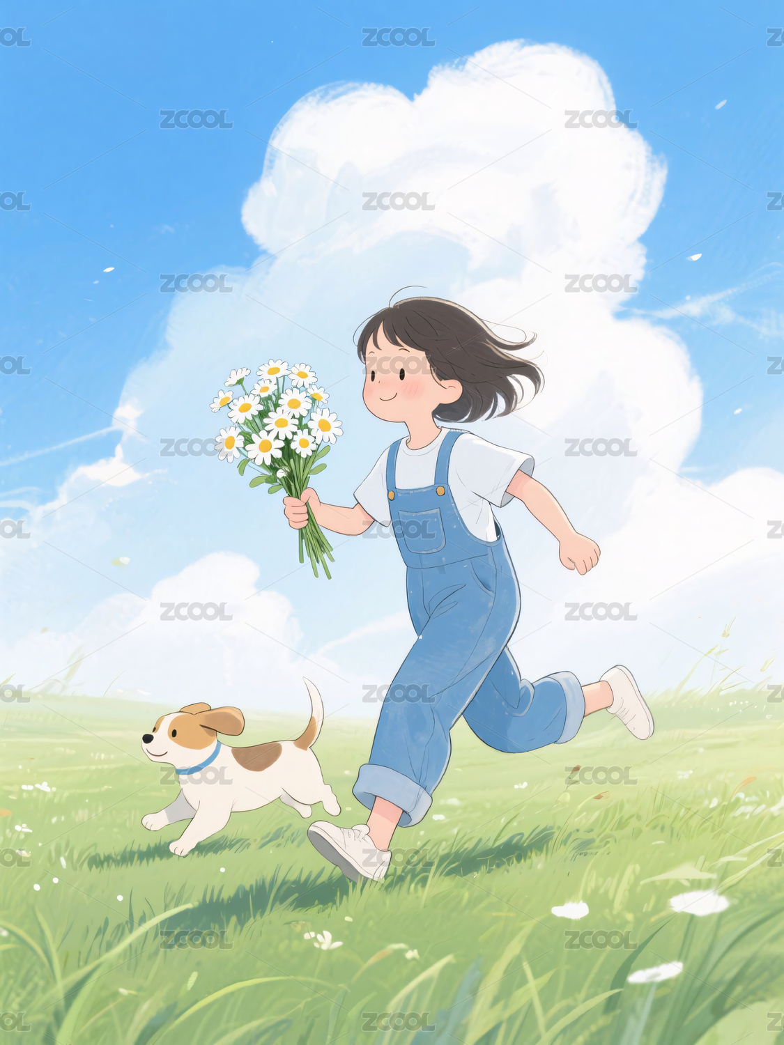 儿童,小狗,草地,蓝天,白云,露营,旅游,假期,油画,电商