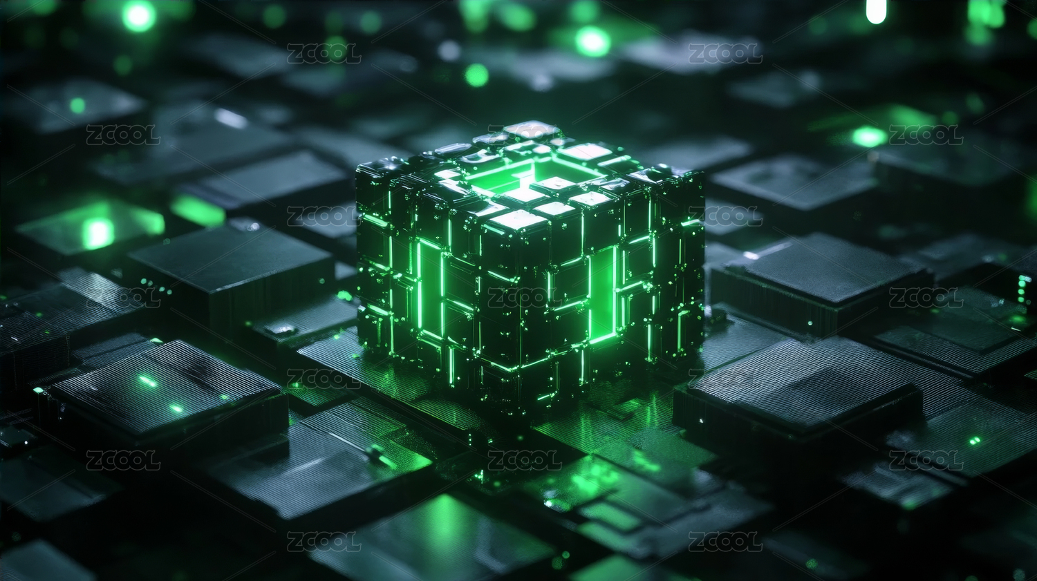 科技感十足的电路板上发光立方体