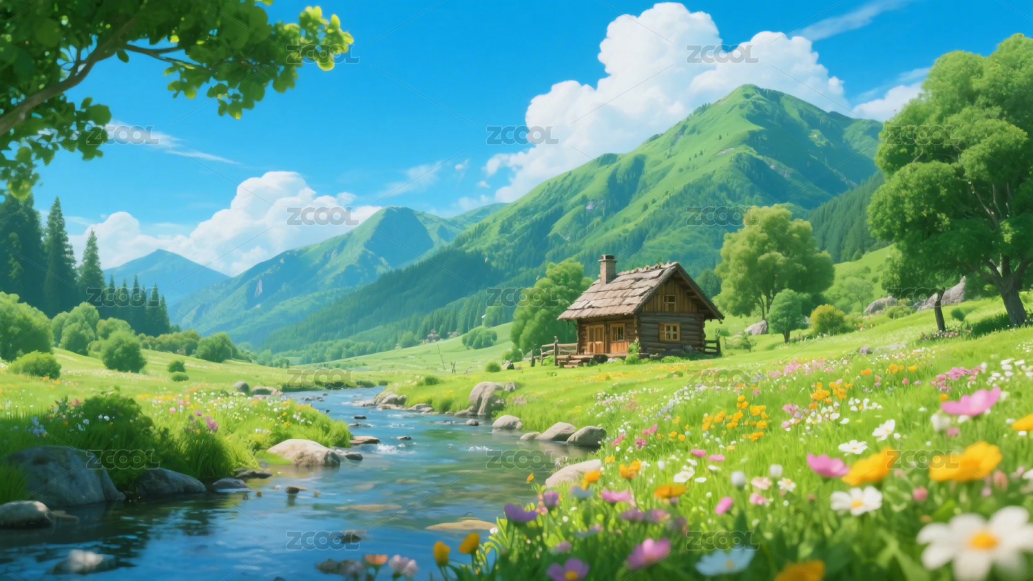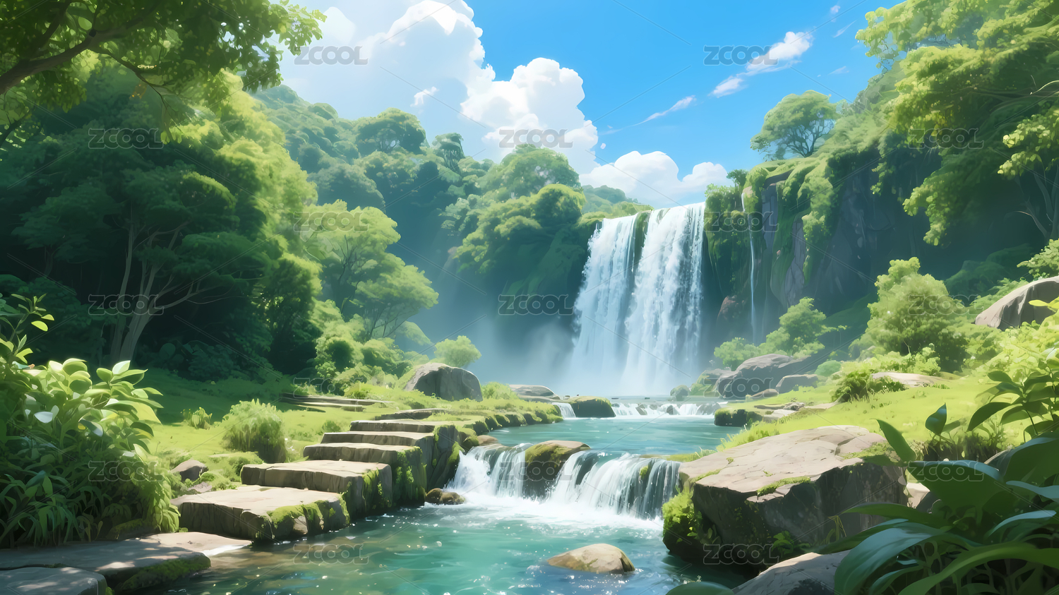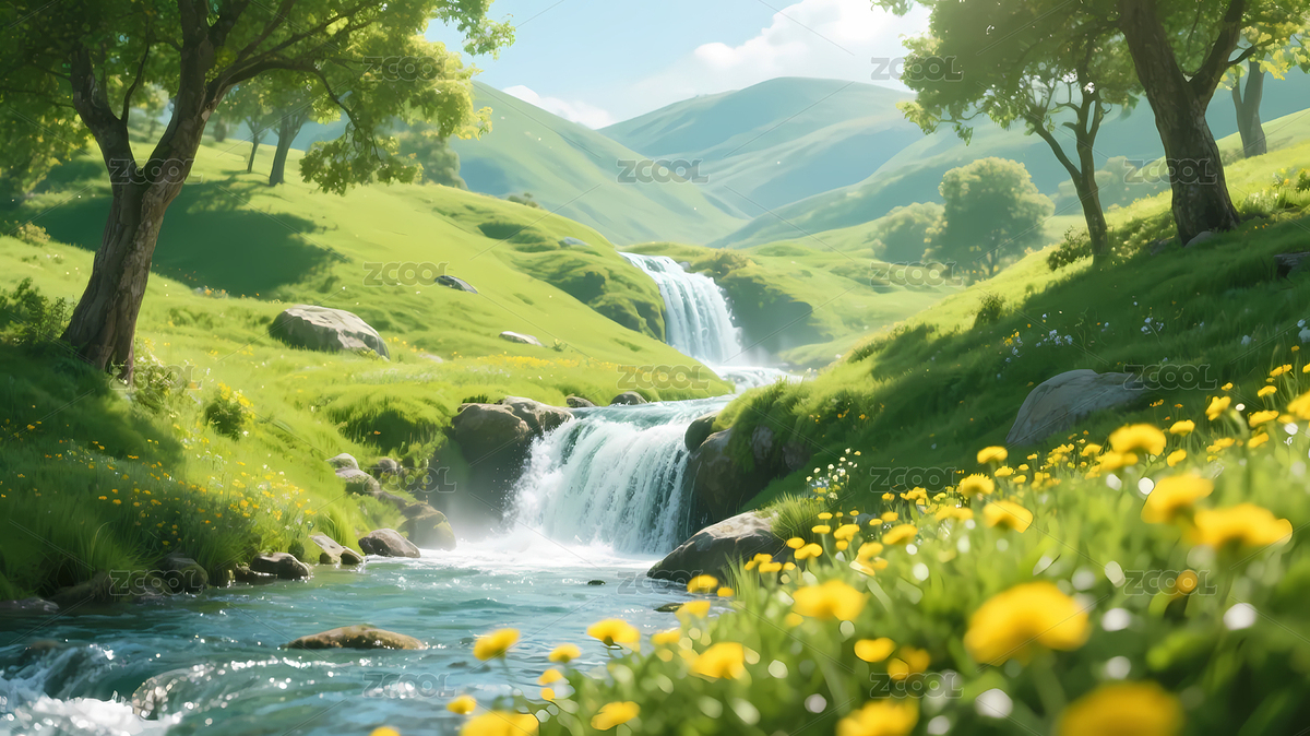 蓝天,黄色,绿色,草地,树木,溪流,小溪,瀑布,山丘,野花