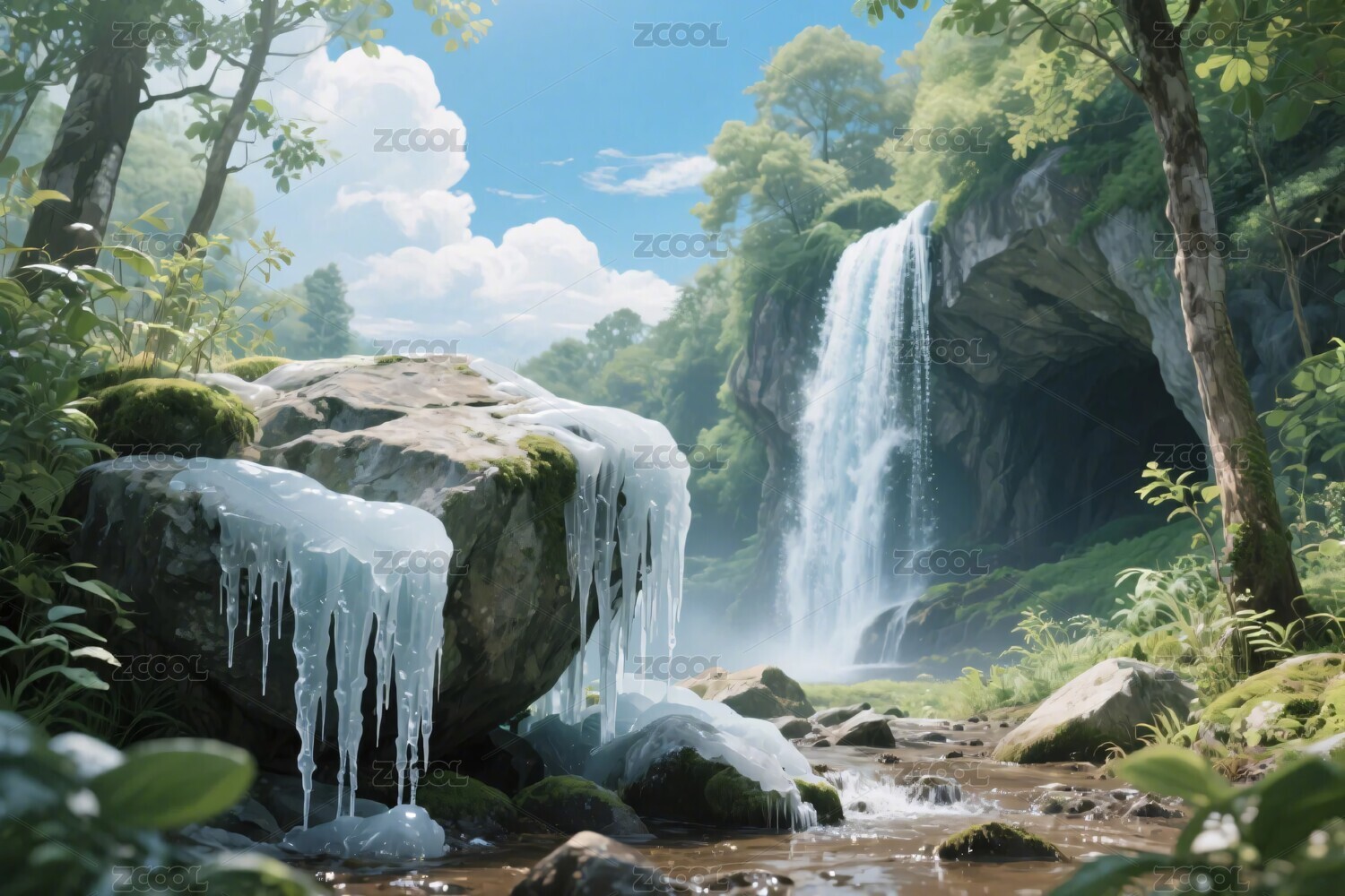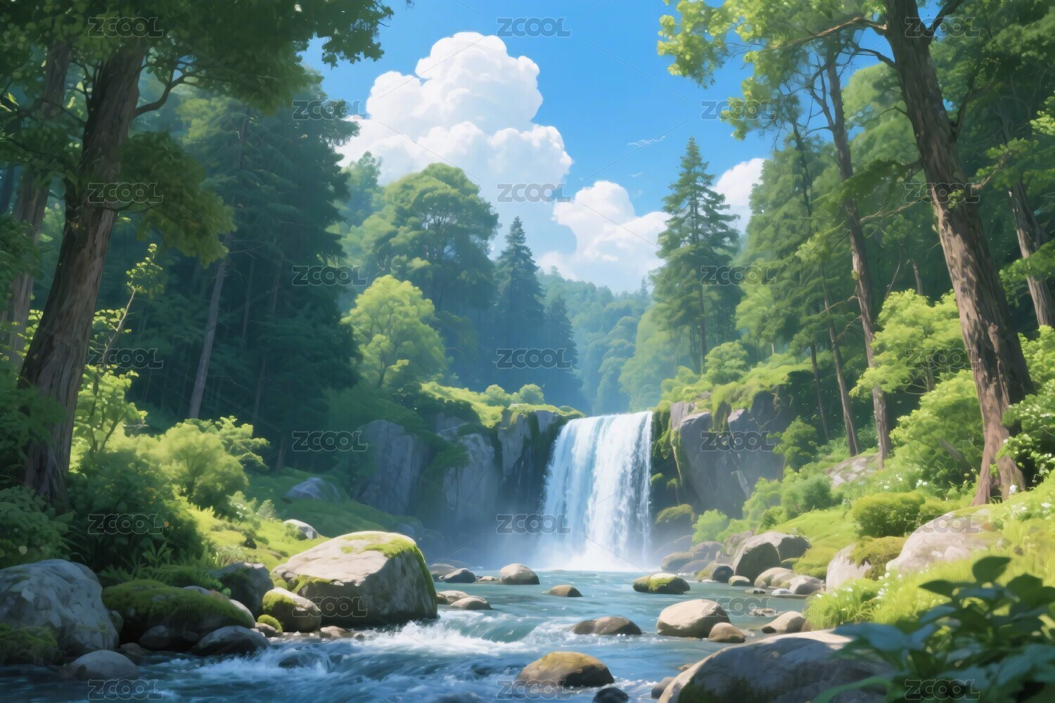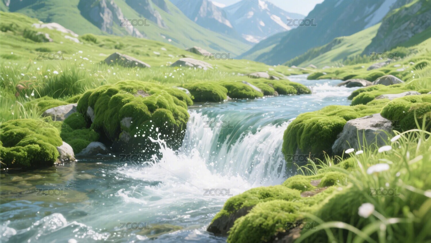 蓝天,黄色,绿色,草地,树木,溪流,小溪,瀑布,山丘,野花