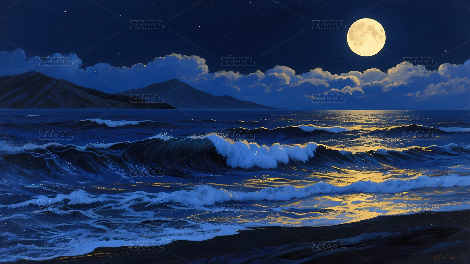 夜晚海浪满月山脉景
