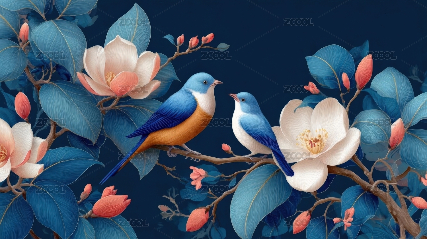 盛开的玉兰花与两羽小鸟