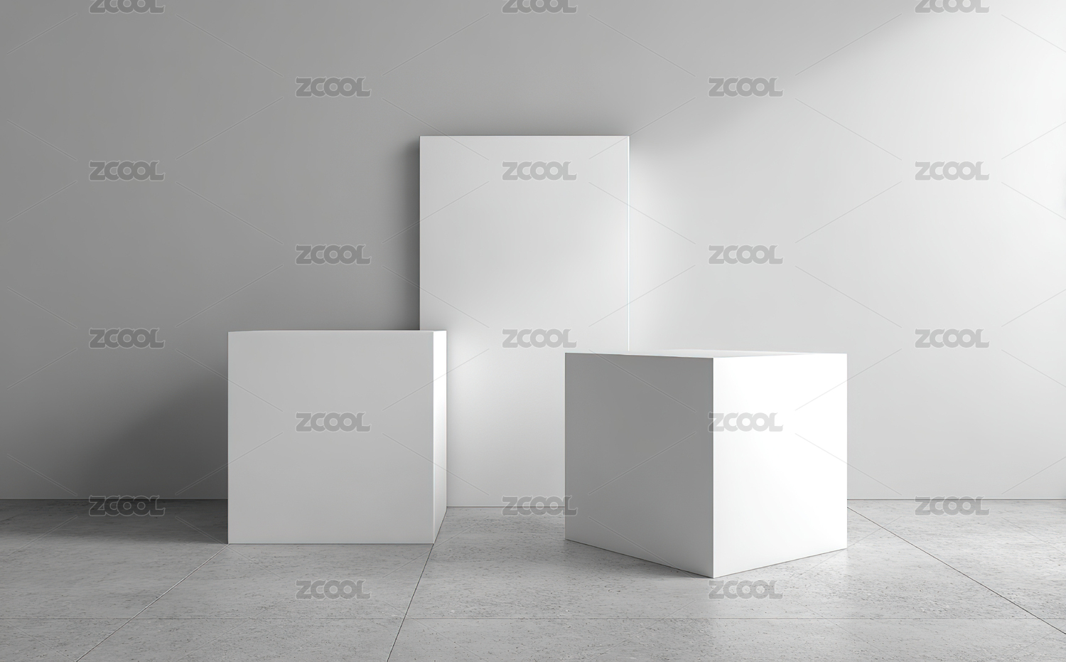 三个白色立方体在光影中