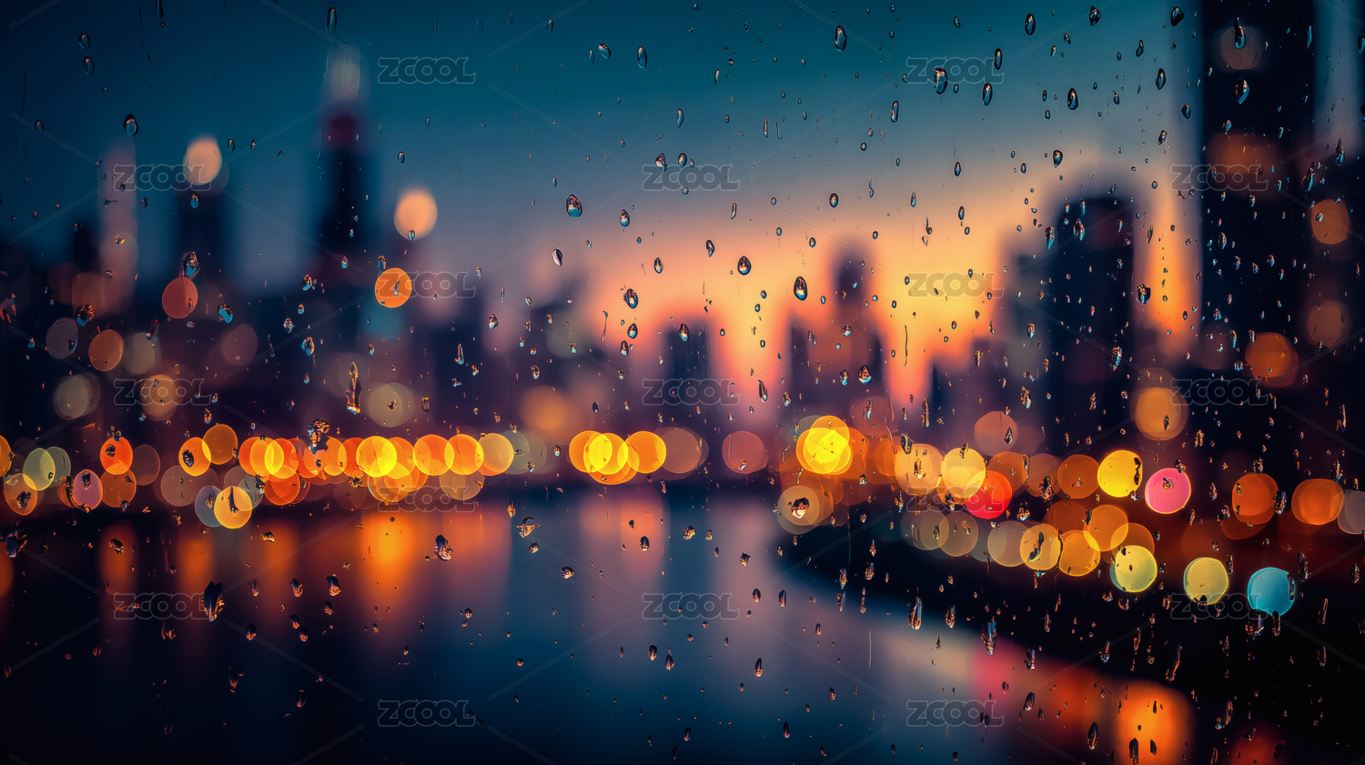 雨夜城市灯光倒影朦胧光晕夜景