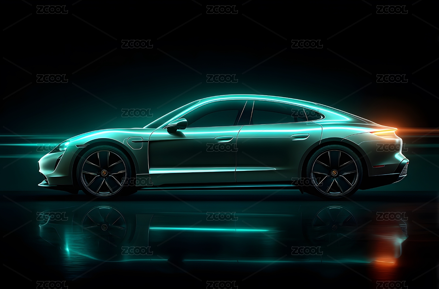 霓虹光影下的保时捷电动轿车