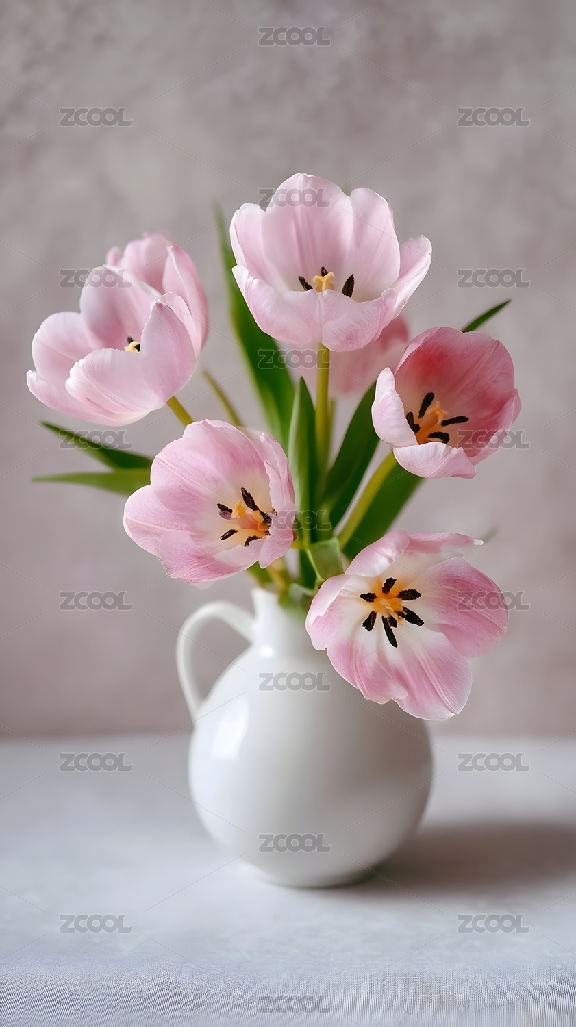 一束美丽的郁金香插在一个透明的玻璃瓶中