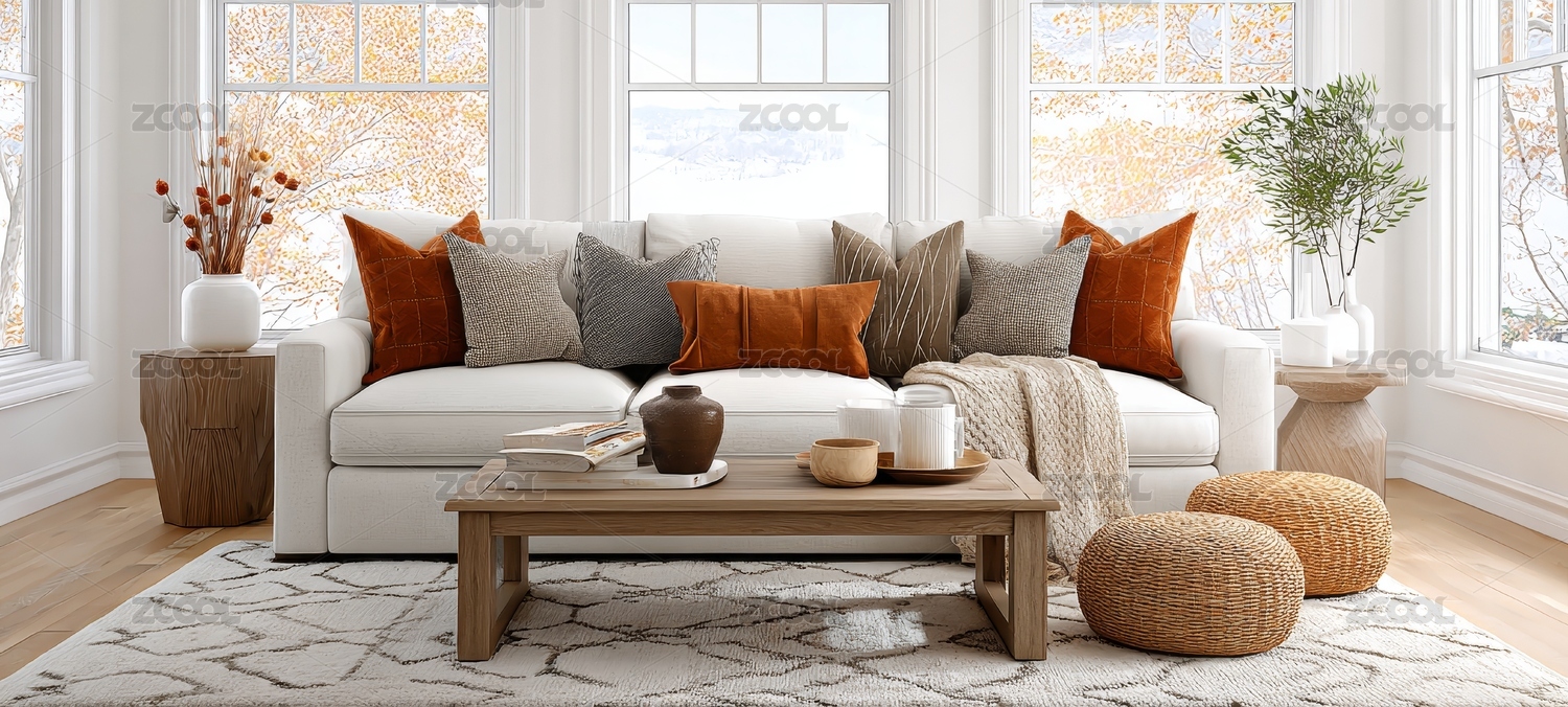 客厅,北欧,宁静,沙发,米白,靠垫,纹理,壁炉,书架,内置