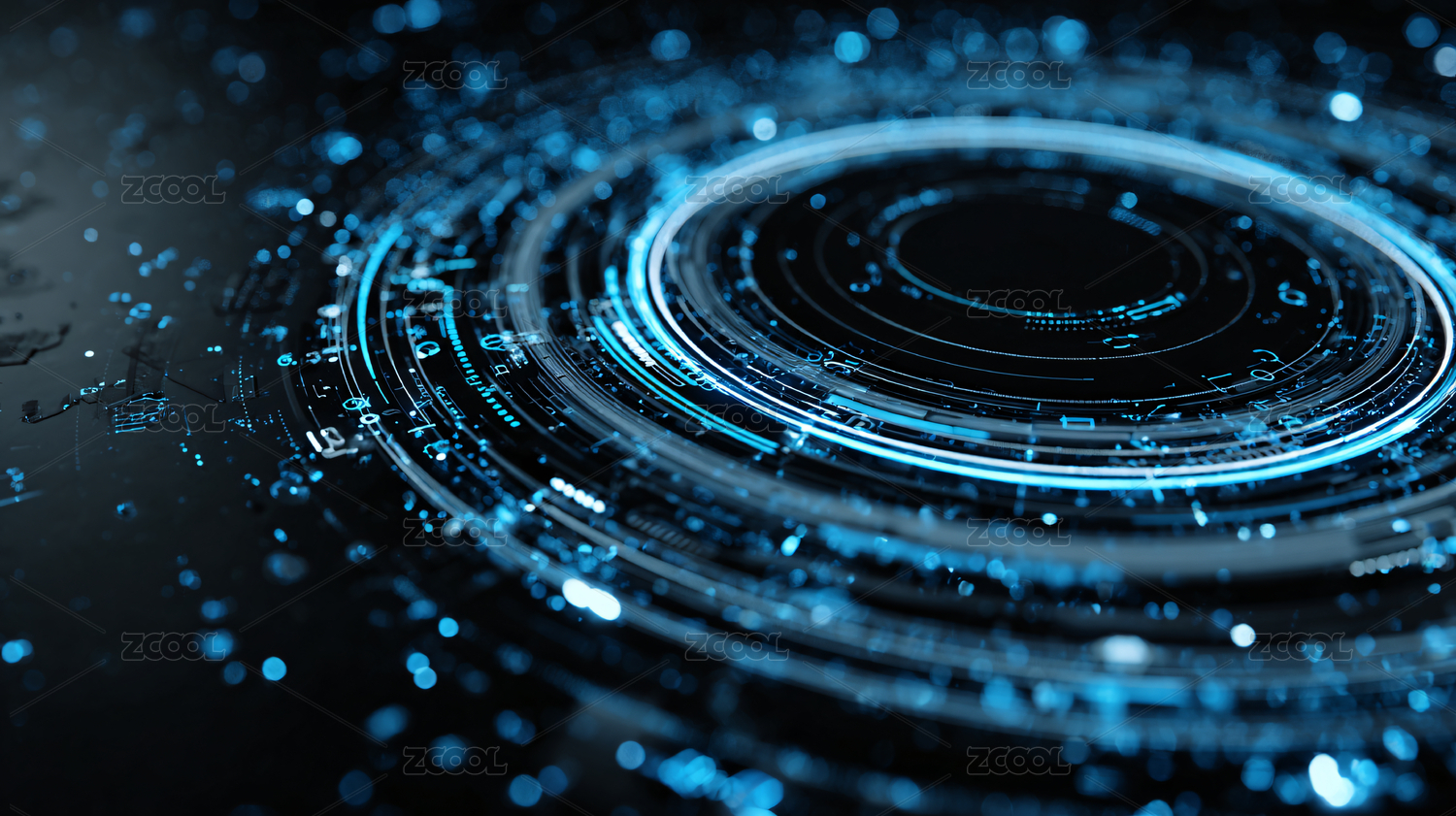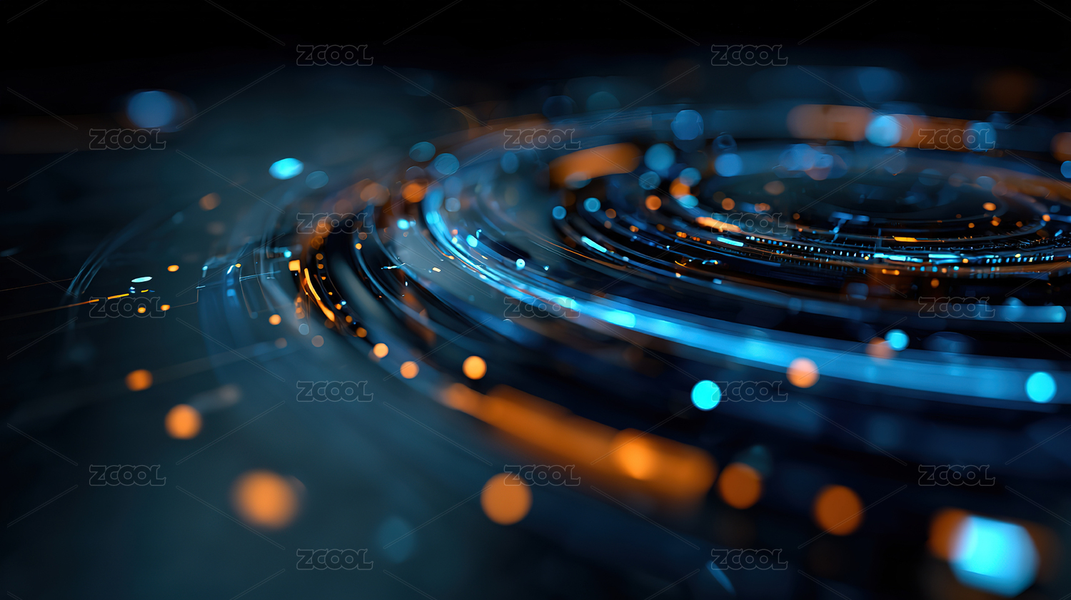 蓝金光圈映衬深色光点背景